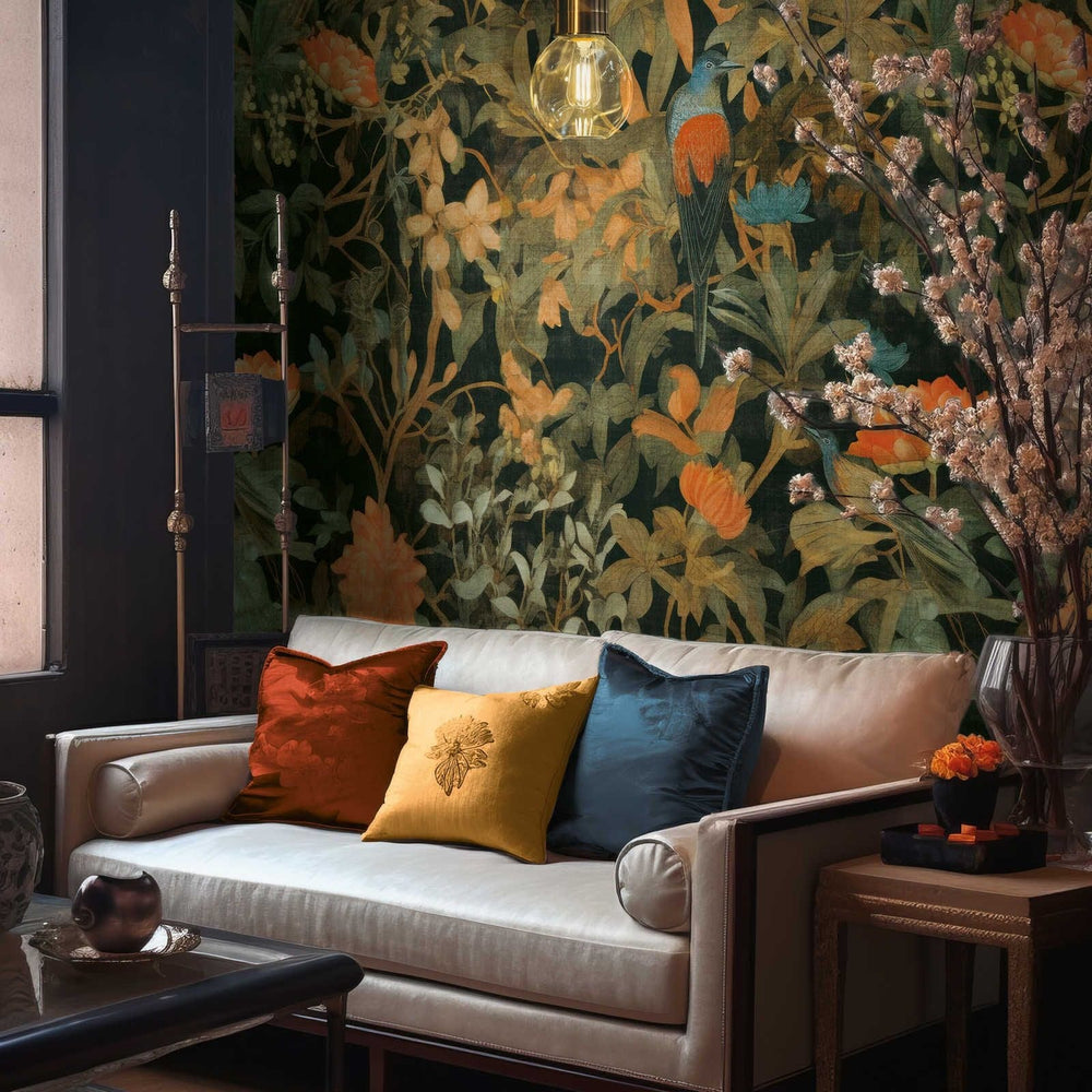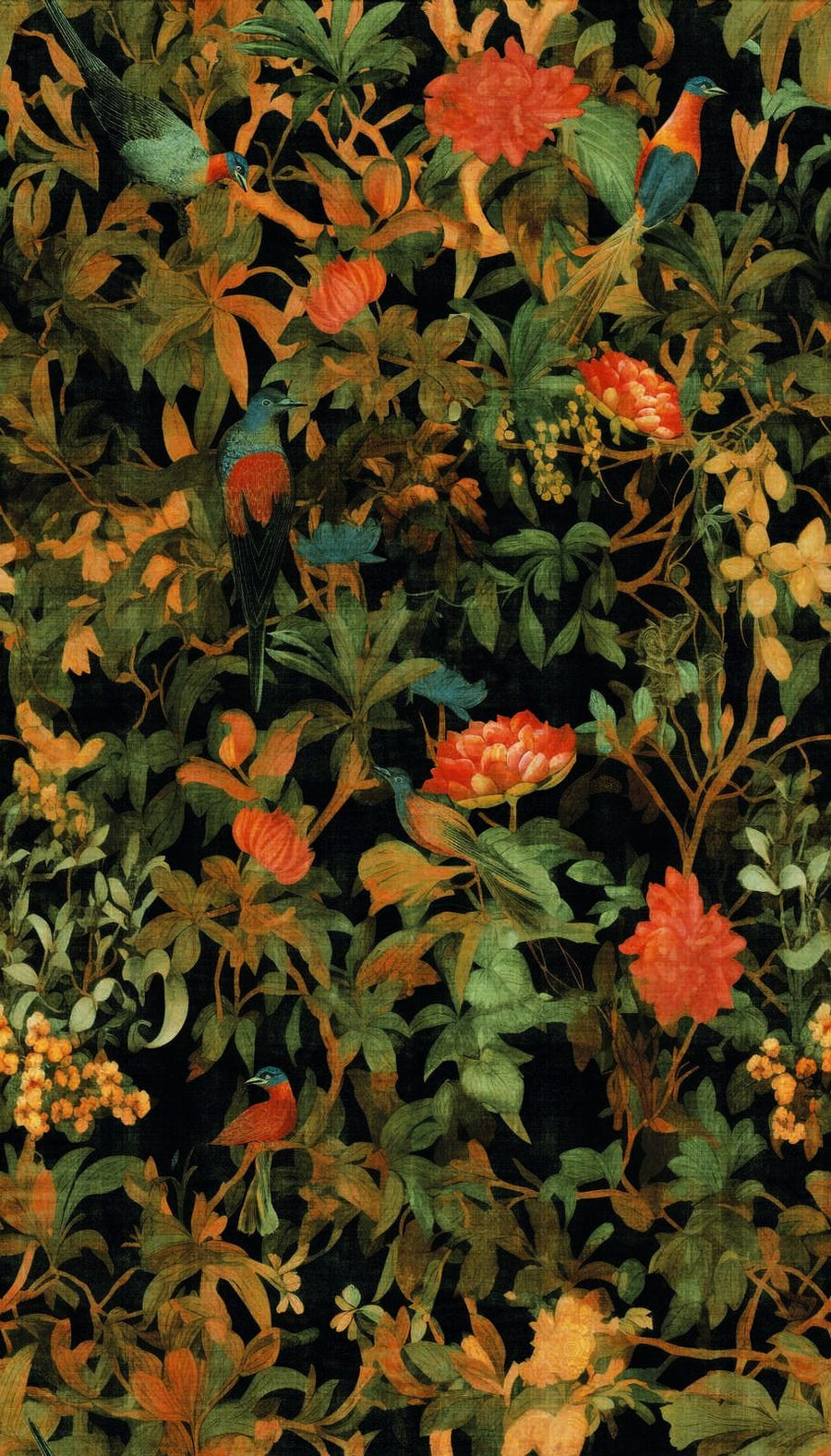 Trooppinen tapetti kirkkaalla kuviolla: kukkia, lehtiä ja papukaijoja, 1407417