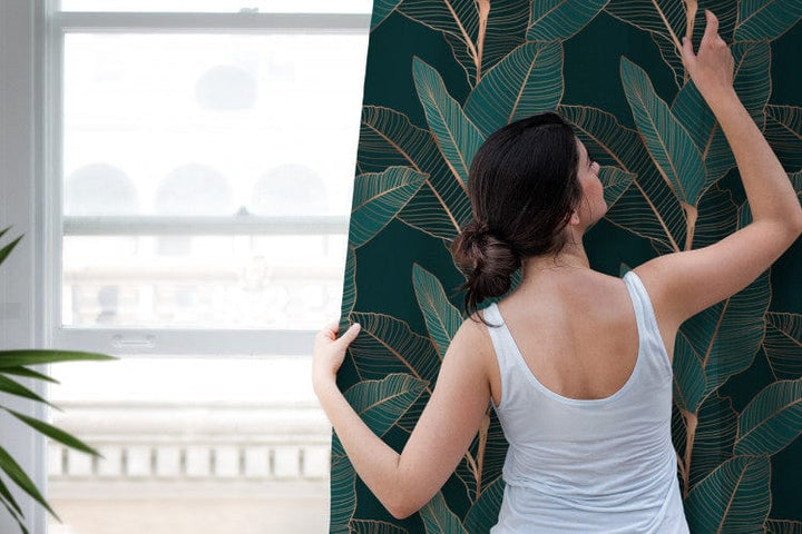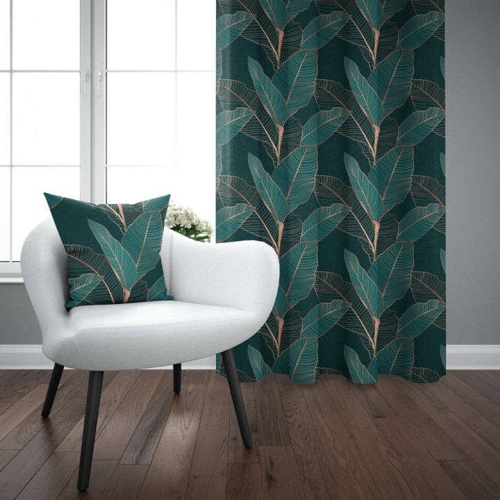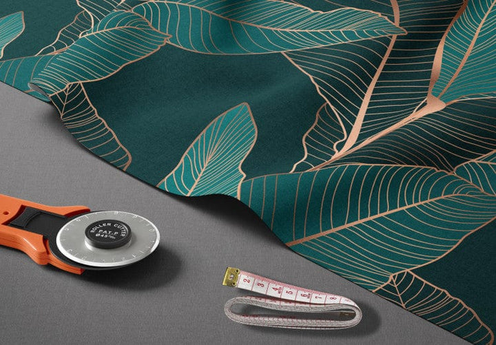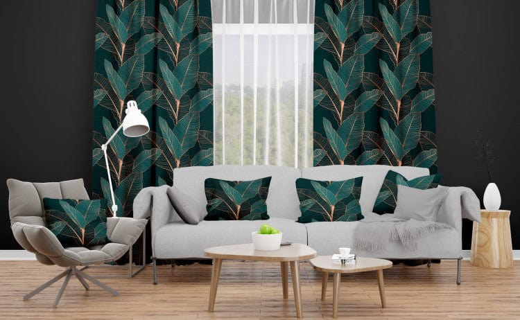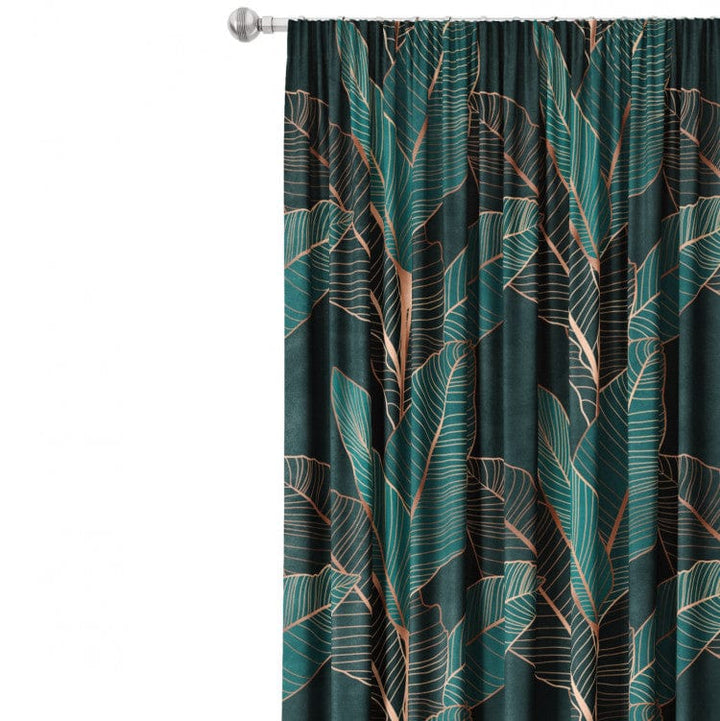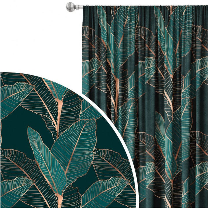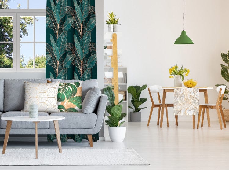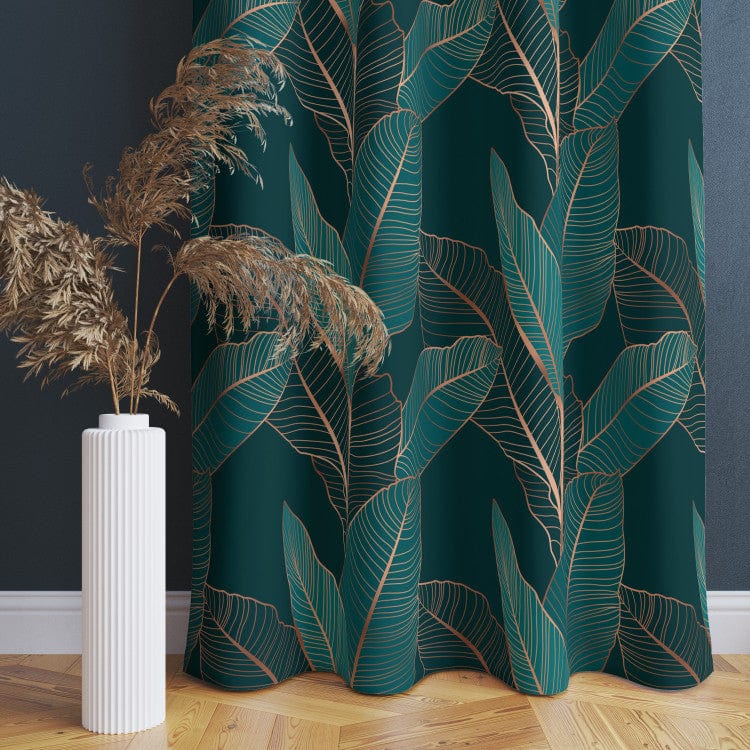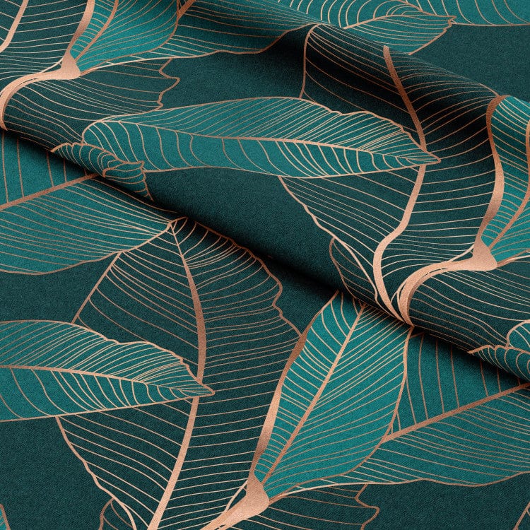 Koristeelliset verhot - Sävellys, jossa fikuksen lehdet kullan ja vihreän sävyissä, 147262