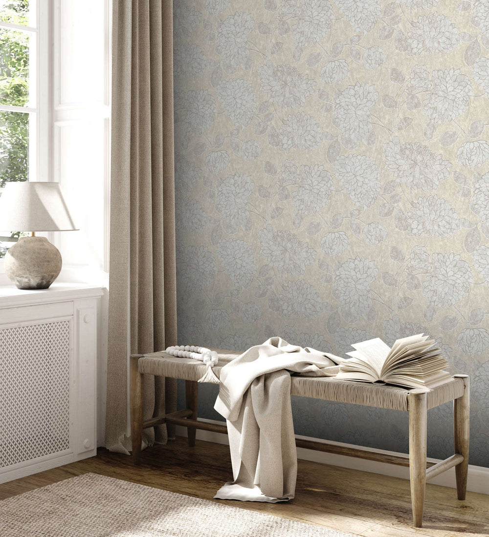 Flizelīna tapetes ar ziedu rakstu - krēma, zaļā, zilā krāsā, 390712 AS Creation