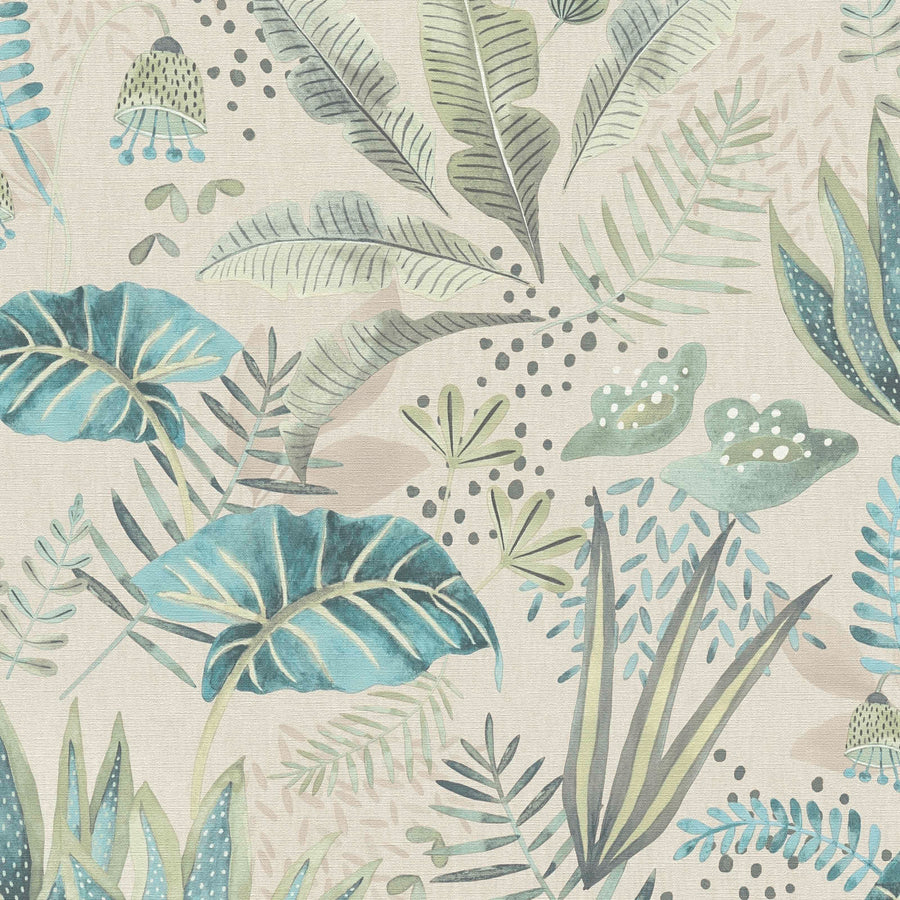 Tapetes ar dažādām lapām: zaļa, krēma, tirkīza, 393484 AS Creation
