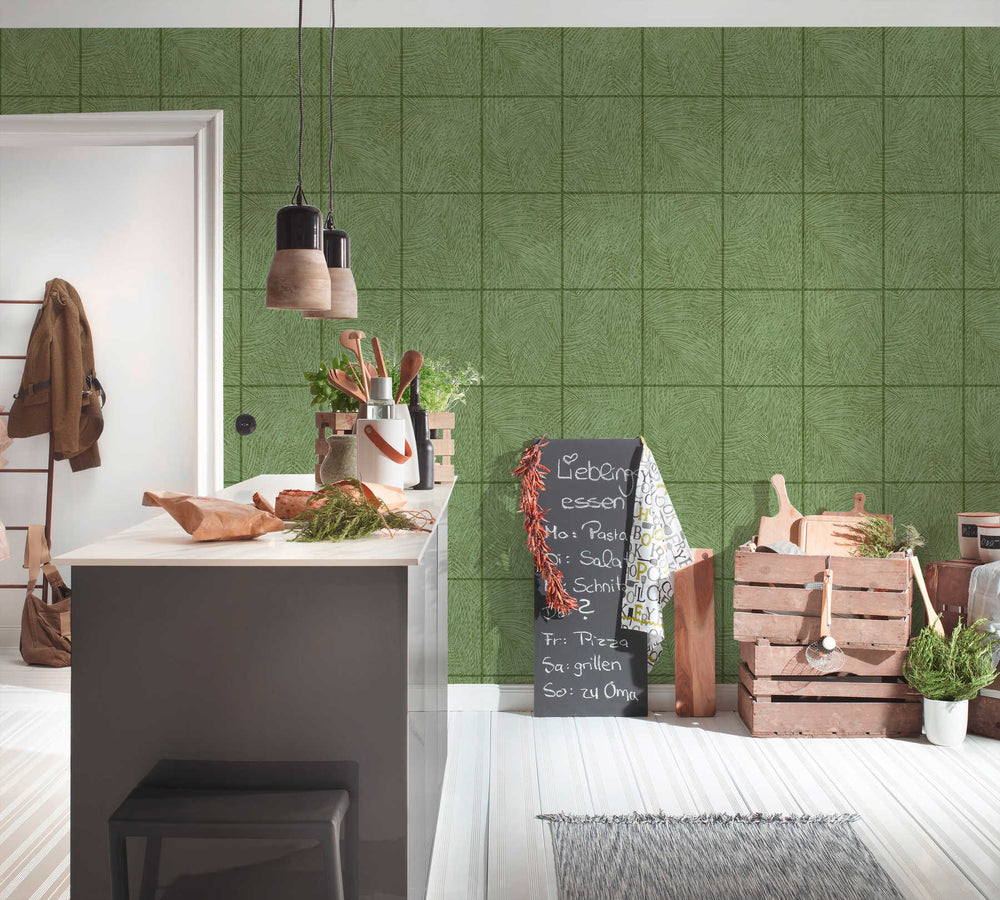 Tapetes ar flīžu dizainu un lapu motīvu - zaļā krasā AS 373721 AS Creation