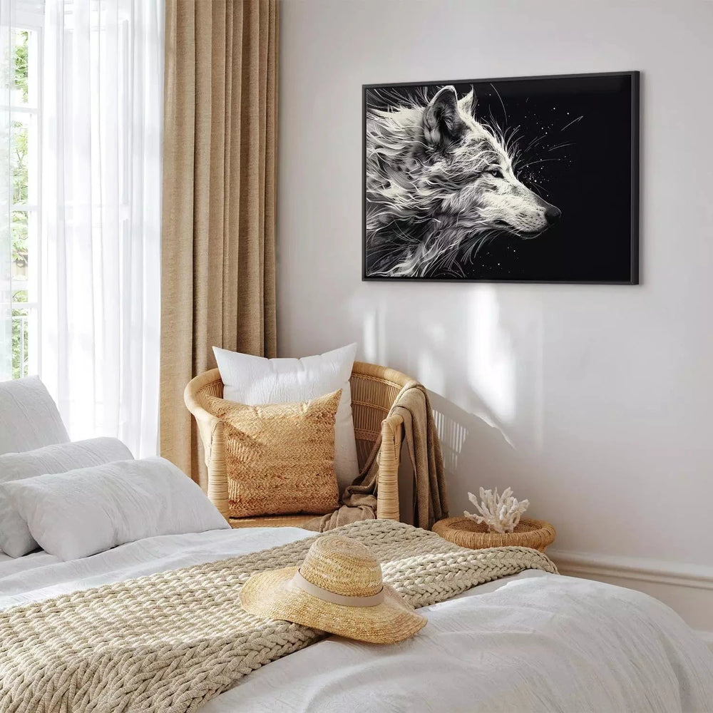 Glezna melnā koka rāmī - Balts vilks uz melna fona - 161980 G ART