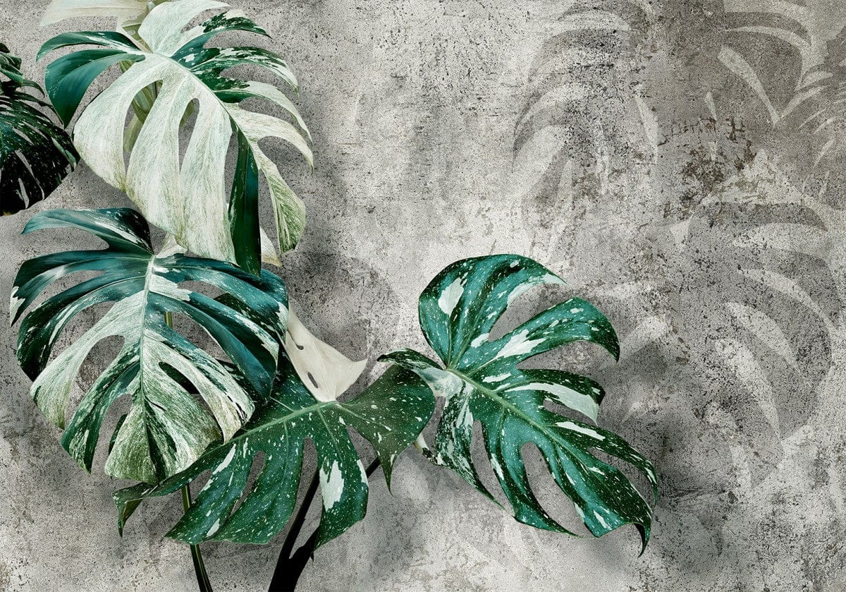 Valokuvatapetti vihreät Monsteran lehdet tummanharmaalla pohjalla, 135503