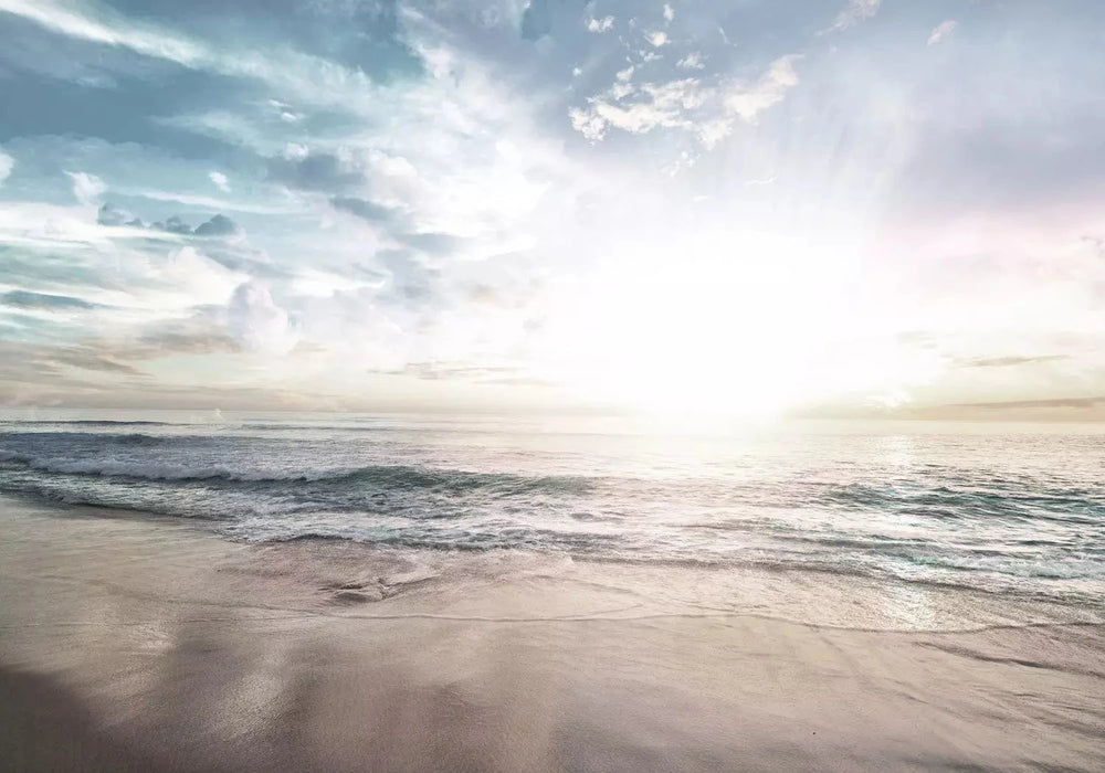 Fototapetes - Rīta pludmale – ainava ar mierīgu jūru, mākoņiem un sauli G-ART