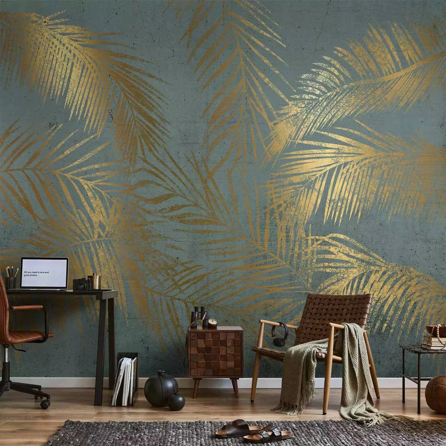 Valokuvatapetti - Kultaiset palmunlehdet sinisellä taustalla - 138210
