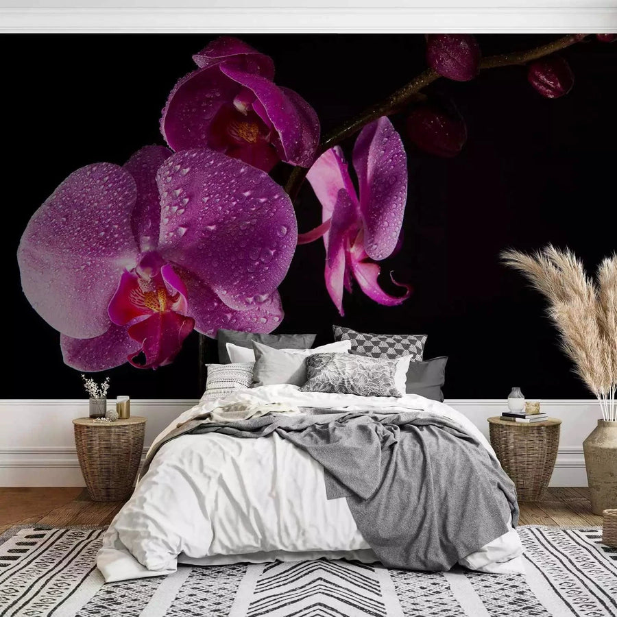 Fototapetes - Eleganta orhideja ar rasas pilieniem uz melna fona G-ART