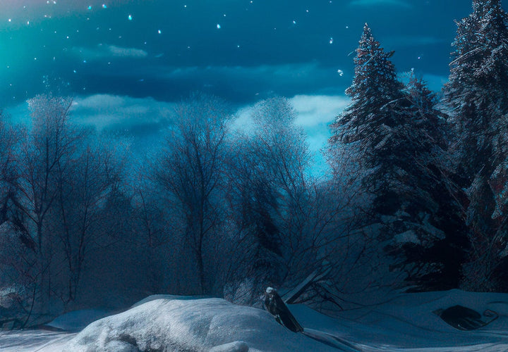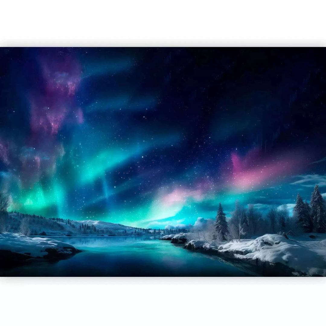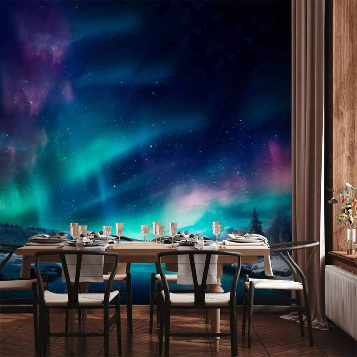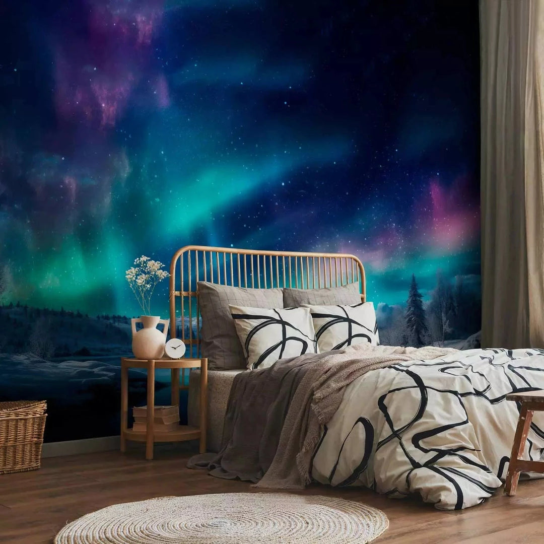 Valokuvatapetti - Värikkäät revontulet yötaivaalla metsän yläpuolella, 151865