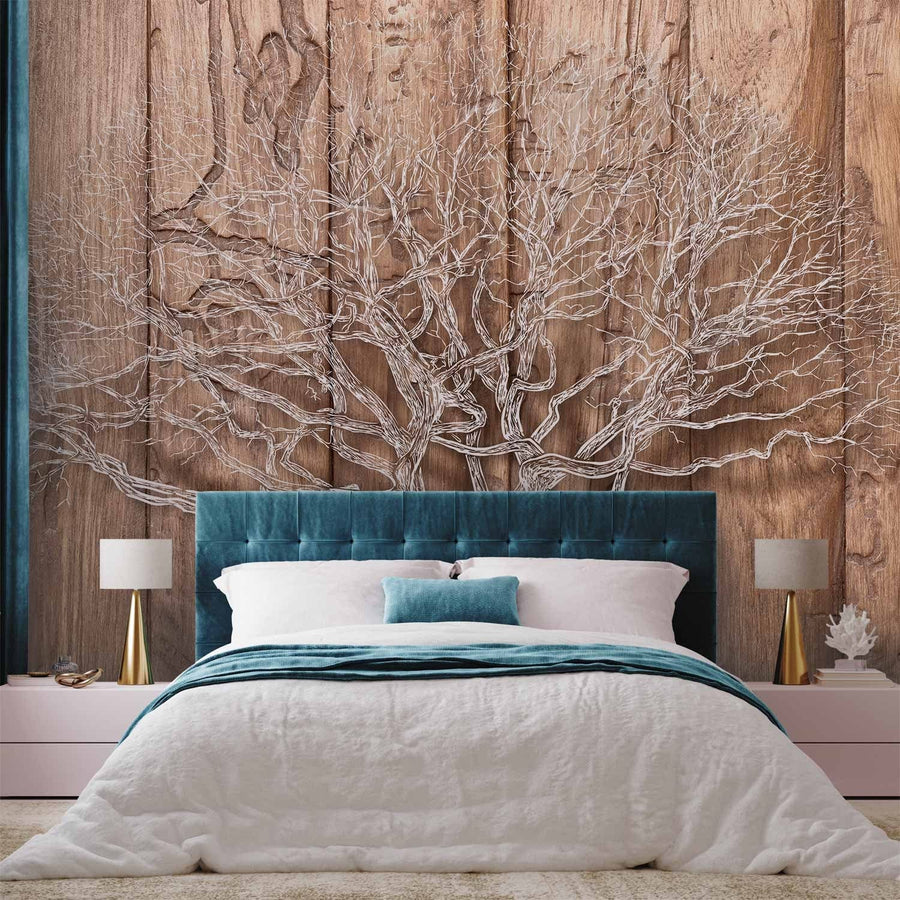 Dabas fototapetes -  koks bez lapām uz brūnu koka dēļu fona, 64626 G-ART