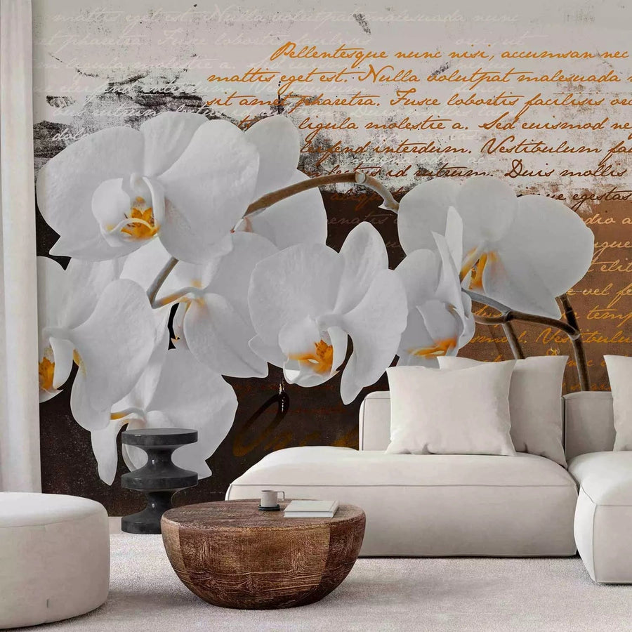 Fototapetes ar orhidejam balta krāsā un uzrakstiem zeltā krāsā, 60237  G-ART