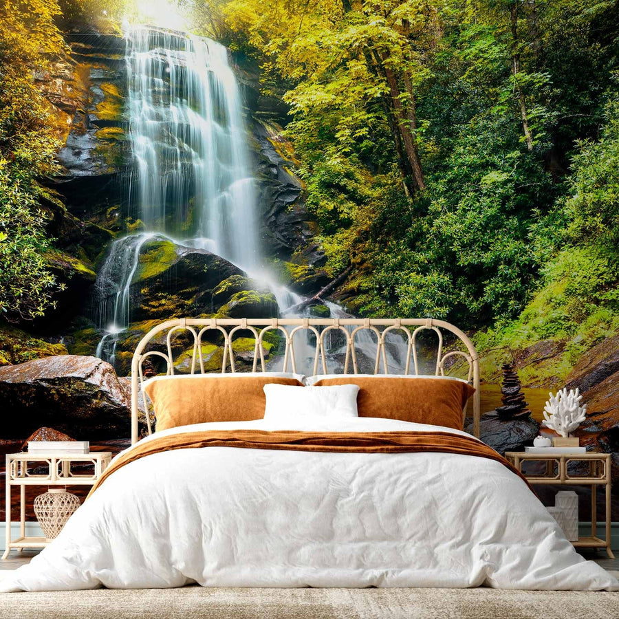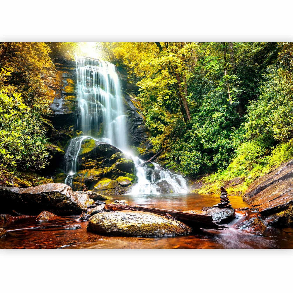Valokuvatapetti - Maisema, jossa vesiputous virtaa kivien yli keskellä metsää, 60062
