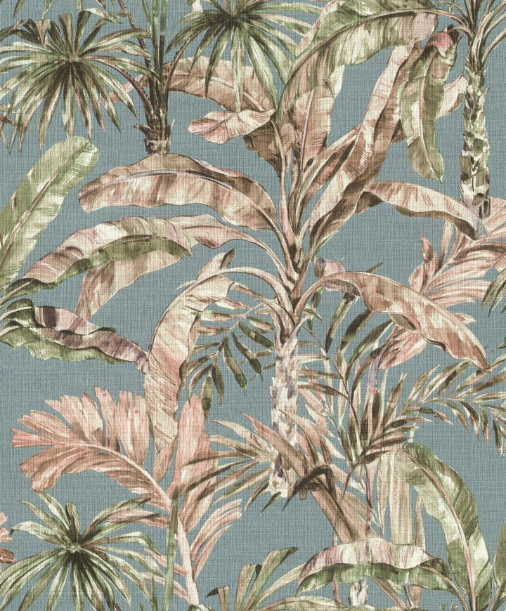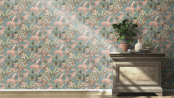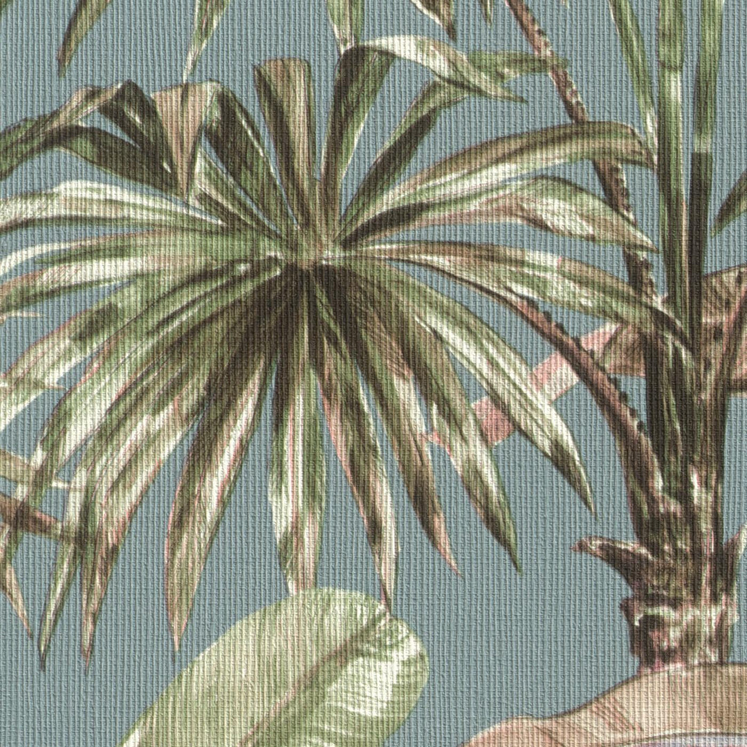 Sinun ei tarvitse matkustaa kauas nauttiaksesi trooppisesta lomasta. Loppujen lopuksi pienimmissäkin hytteissä on tilaa Karibian tunnelmalle. Kyyhkysensinisellä, tyylikkään kankaan kaltaisella kuvioidulla pohjalla voit luoda minkä tahansa seinän ilmeen eksoottisilla kasveilla, kuten banaaninlehdillä ja palmupuilla vihreän, vaaleanpunaisen ja ruskean eri sävyissä - ilman, että sinun tarvitsee käyttää vihreitä sormiasi!