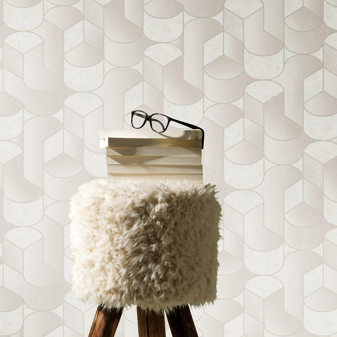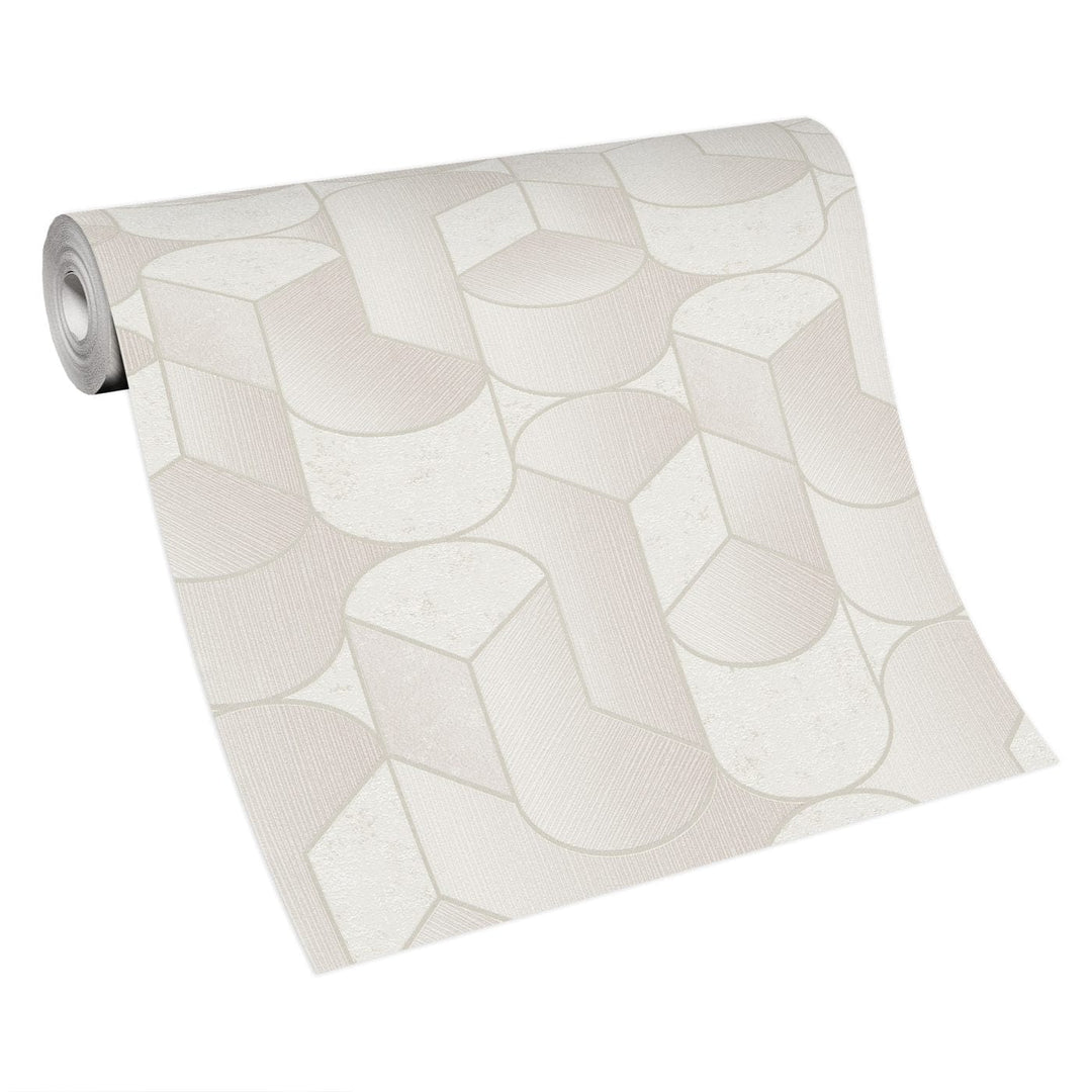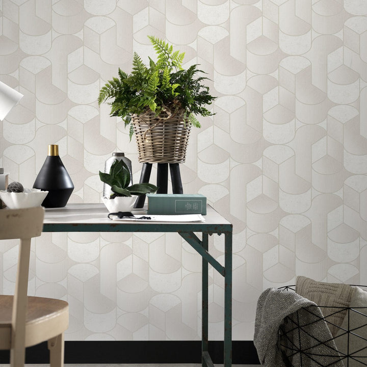 Taustakuva geometrinen kuvio Art Deco tyyliin kerma, artikkeli 3754145, valmistaja Erismann (Saksa). Klassinen art deco -kuvio, jossa on kiiltävät ääriviivat hieman kuvioidulla ja mattapintaisella pinnalla, mikä luo ylellisen ja harmonisen sisustuksen korostuksen. Materiaali: fleecetapetti. Rullan koko 0,53x10 m.