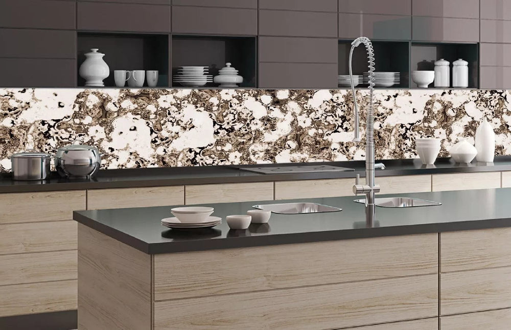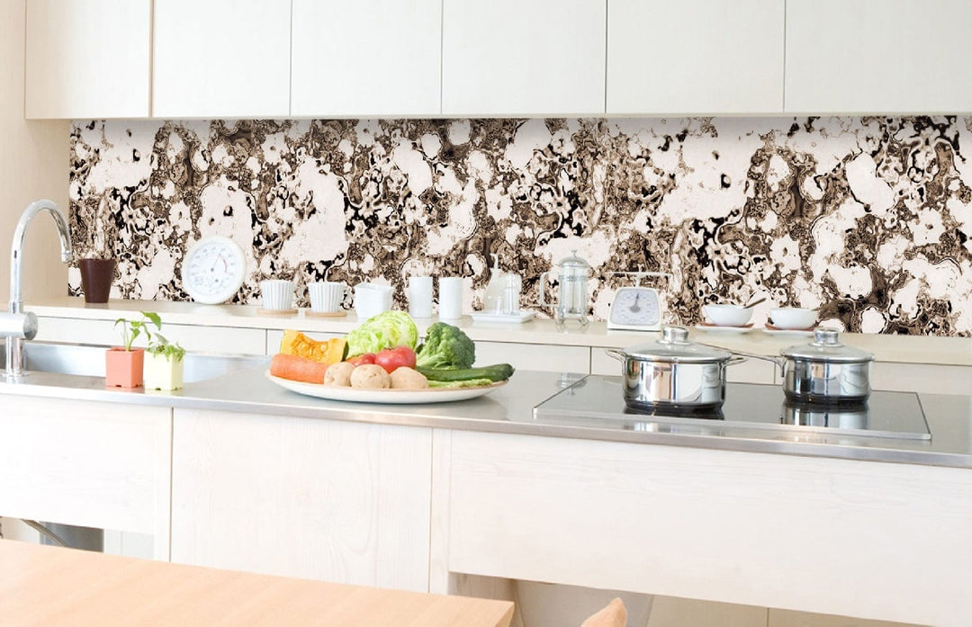 Jaunākās virtuves dizaina tendences pievērš uzmanību pašlīmējošām foto tapetēm virtuves aizmugurējai sienai. Tā vietā, lai noklātu virtuves aizmugurējo sienu ar flīzēm, to var noklāt ar plēvi.