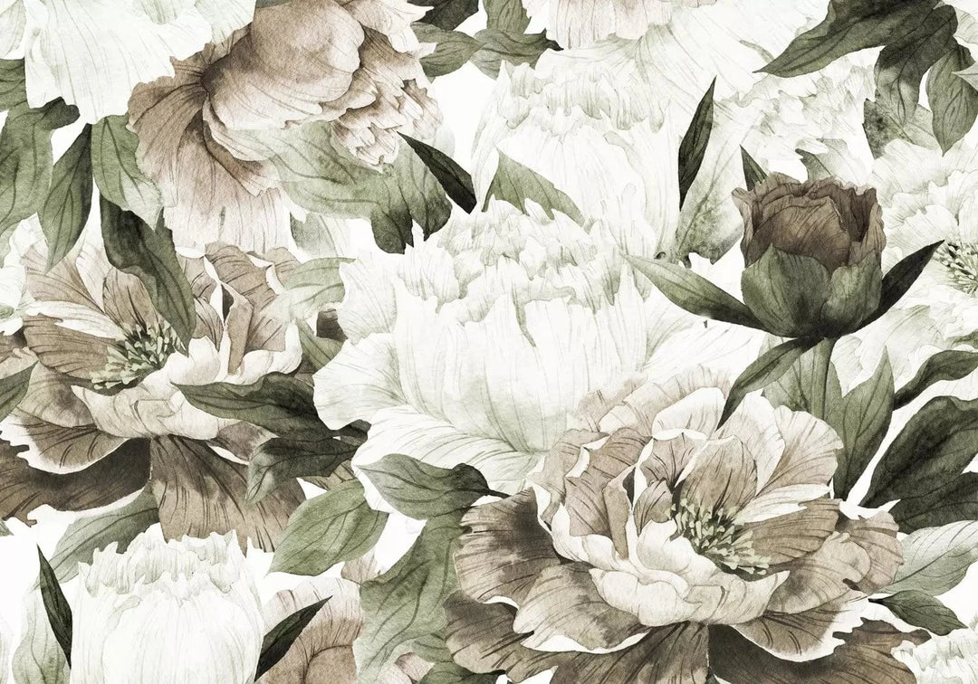 Valokuvatapetti - Kukkivat kukat - kukkakuvio, jossa pionit ja lehdet, 135797