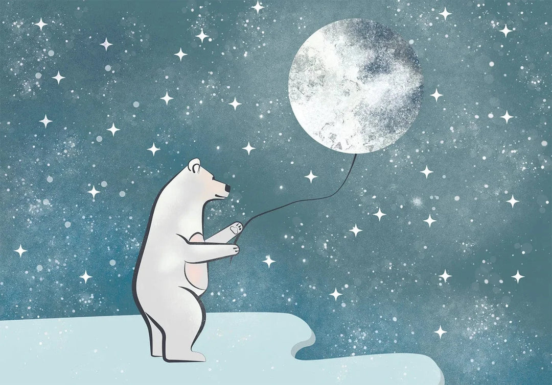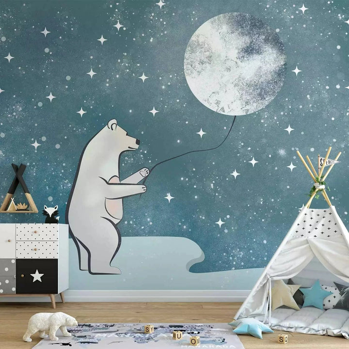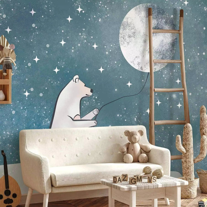 Valokuvatapetti lapsille - valkoinen karhu pallokuun muodossa sinisellä pohjalla - 142988