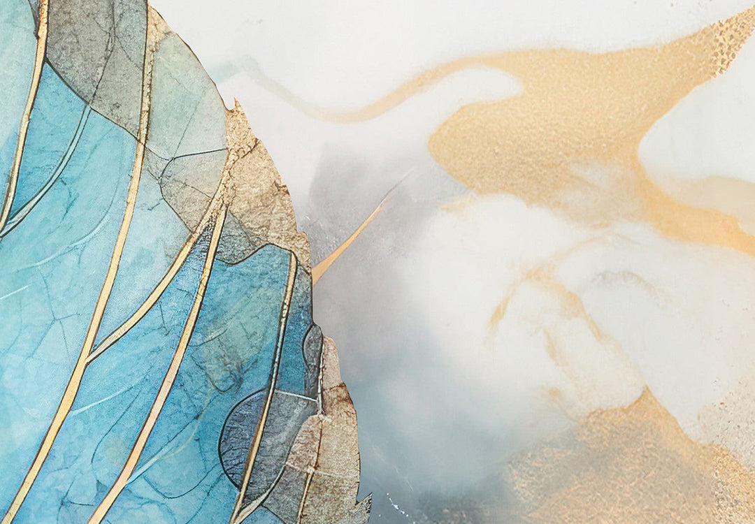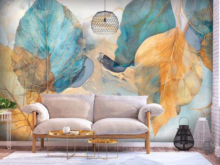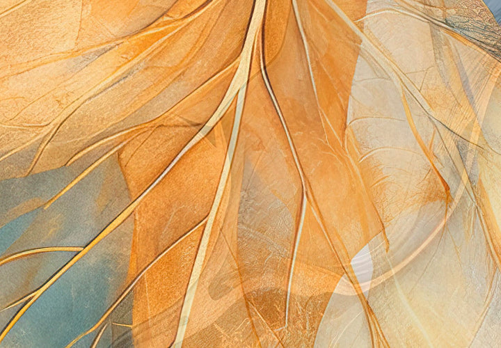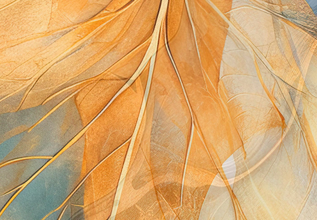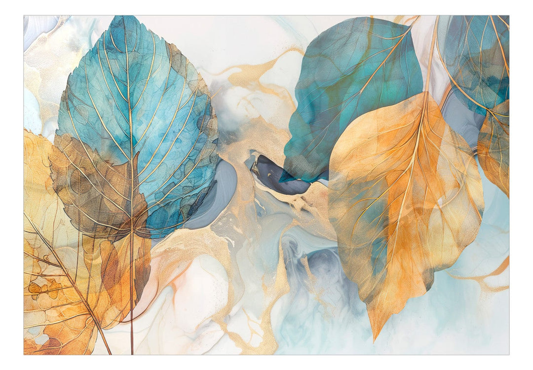 Valokuvatapetti - Oransseja ja turkooseja lehtiä sumuisella taustalla, 151907