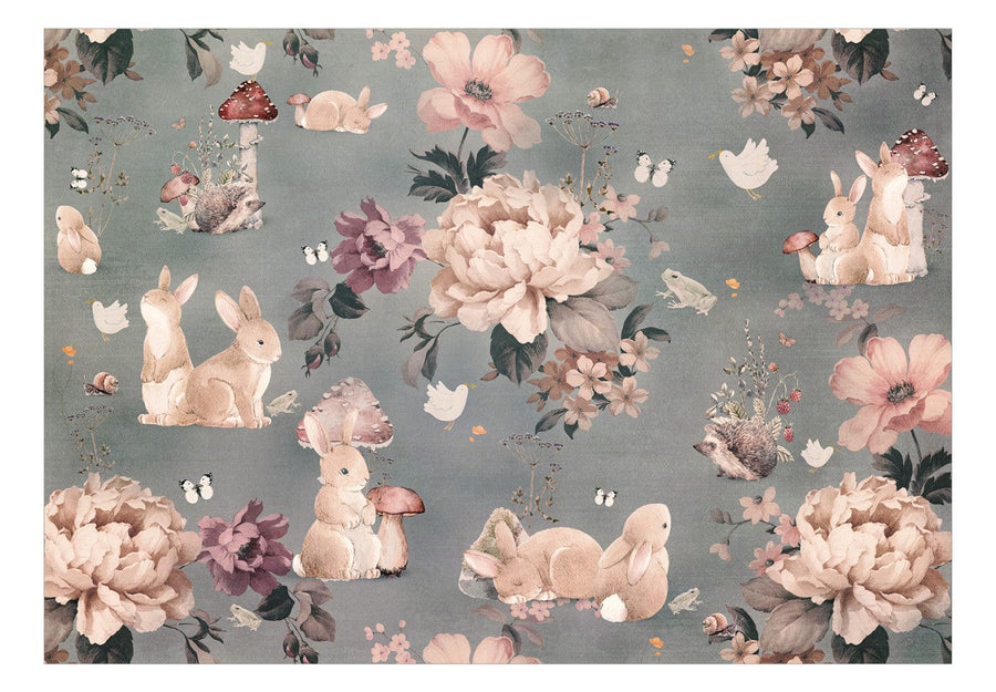 Valokuvatapetti - Metsän eläimiä kukkien keskellä harmaalla taustalla, 149203