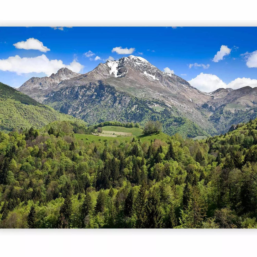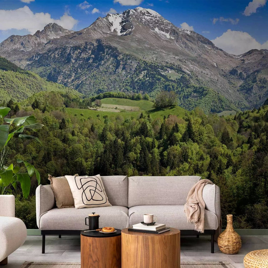 Fototapetes - ainava ar augstiem kalniem starp zaļiem pakalniem G-ART