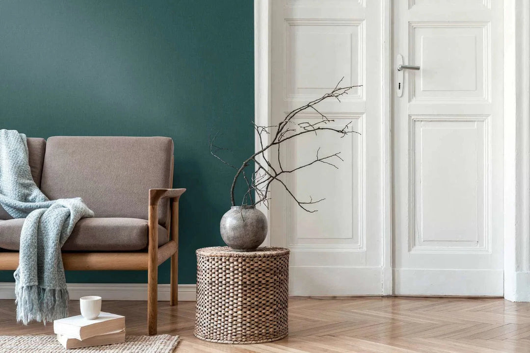 Daniel Hechterin vihertävän sininen tapetti, jossa on tekstiilitekstuuri, antaa raikkaan ja harmonisen ilmeen.