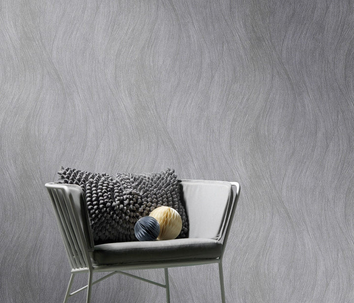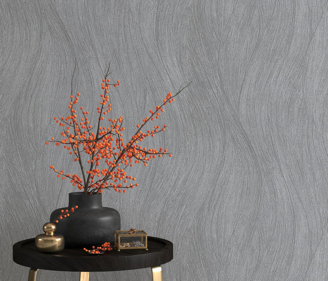 Ainutlaatuinen tapetti, jossa on aaltoileva kuvio, mattapinta ja kiiltäviä elementtejä. Sen hieman kuvioitu, tummanharmaa sävy lisää hienostuneisuutta ja syvyyttä mihin tahansa huoneeseen. Tee kannanotto tällä modernilla tapetilla, joka lisää nykyaikaista tyyliä ja modernia tunnelmaa.