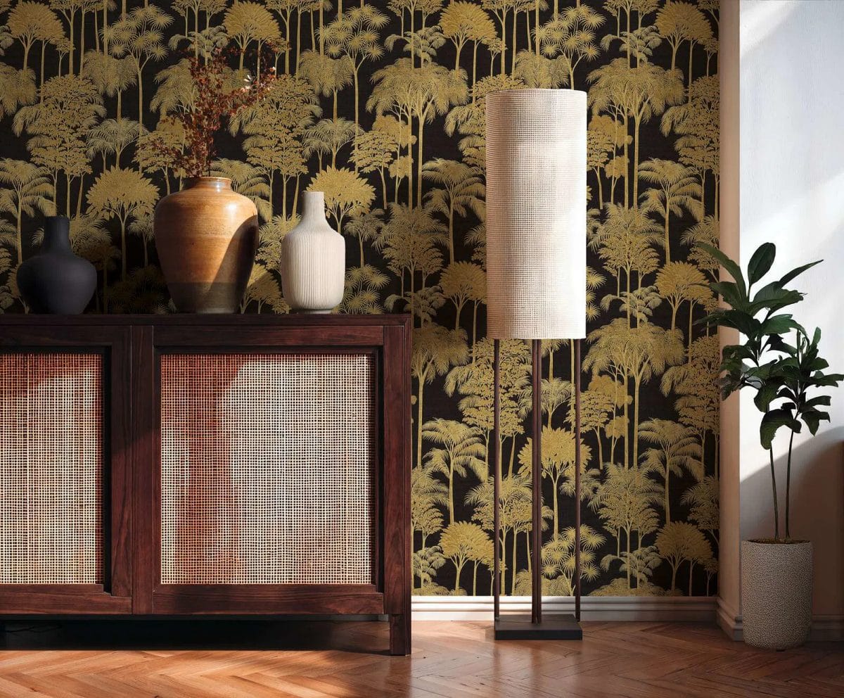 Kuitukangastapetti, jossa on taiteellisesti suunniteltu palmutaustakuosi ja voimakas kasvikuosi – 3012107