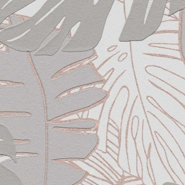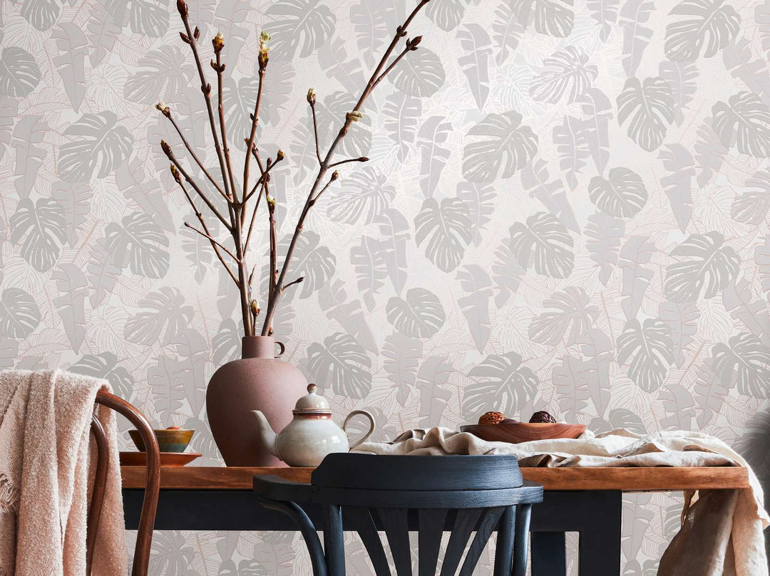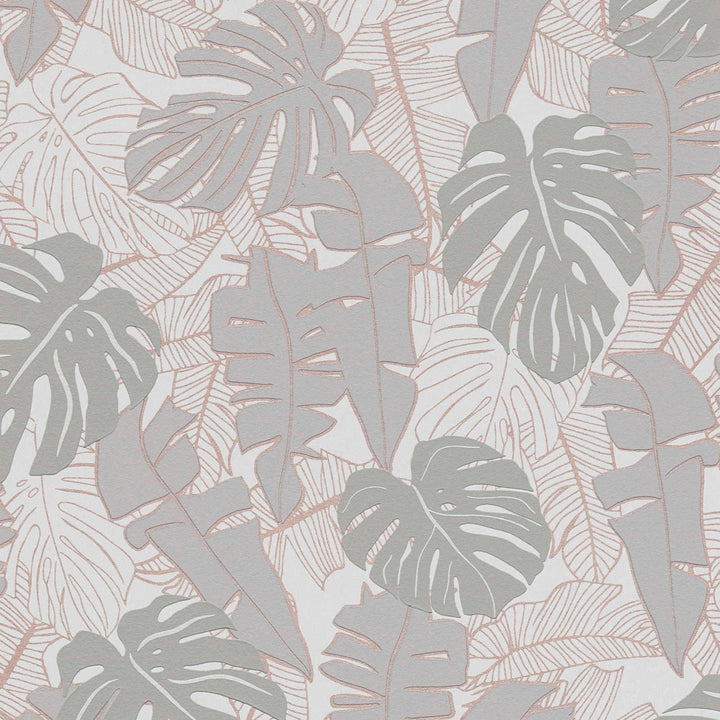 Viidakkotapetti banaaninlehdillä ja metalliefektillä: lämmin harmaa, 1367675