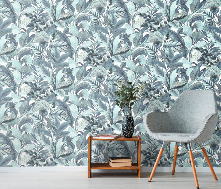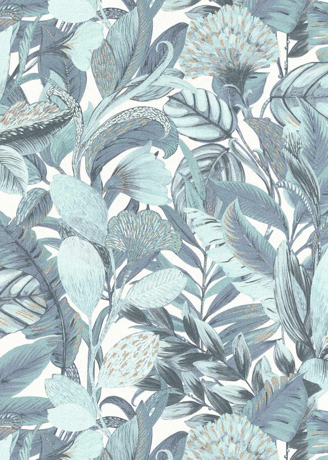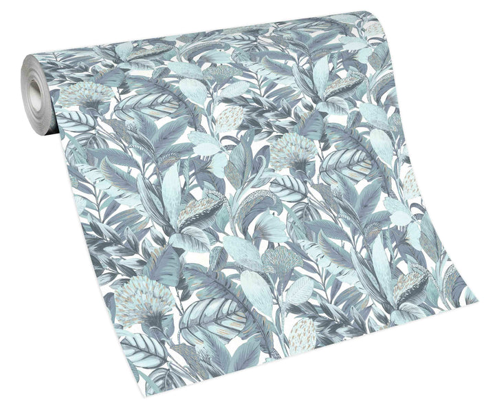 Tässä turkoosissa kasvitieteellisessä tapetissa on eksoottisia lehtiä kiiltävällä viimeistelyllä. Sen upea muotoilu antaa ainutlaatuisen ja tyylikkään ilmeen mihin tahansa huoneeseen, ja se sopii täydellisesti tekemään vaikutuksen.