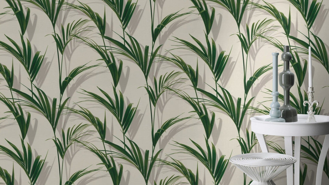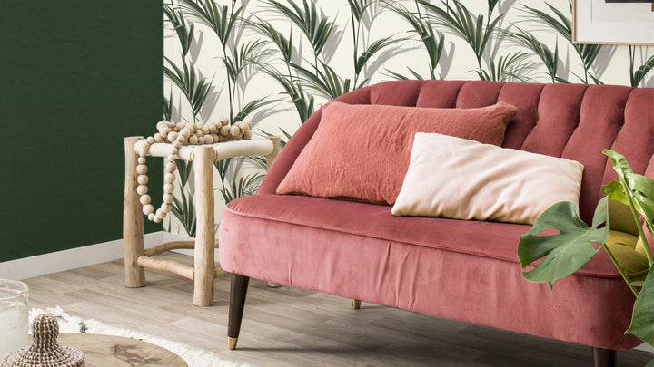 Äskettäin istutettu: Tämä huoneen kämmenlehdet seinällä ovat mehukkaita vihreitä ja vihreitä. Varjopeli tekee suunnittelusta loistavasti realistisen. Kuten tämä värilliset seinäpeitteet, tässä versiossa on hieno pellavarakenne, jonka avulla voit yhdistää ja sovittaa kaiken.