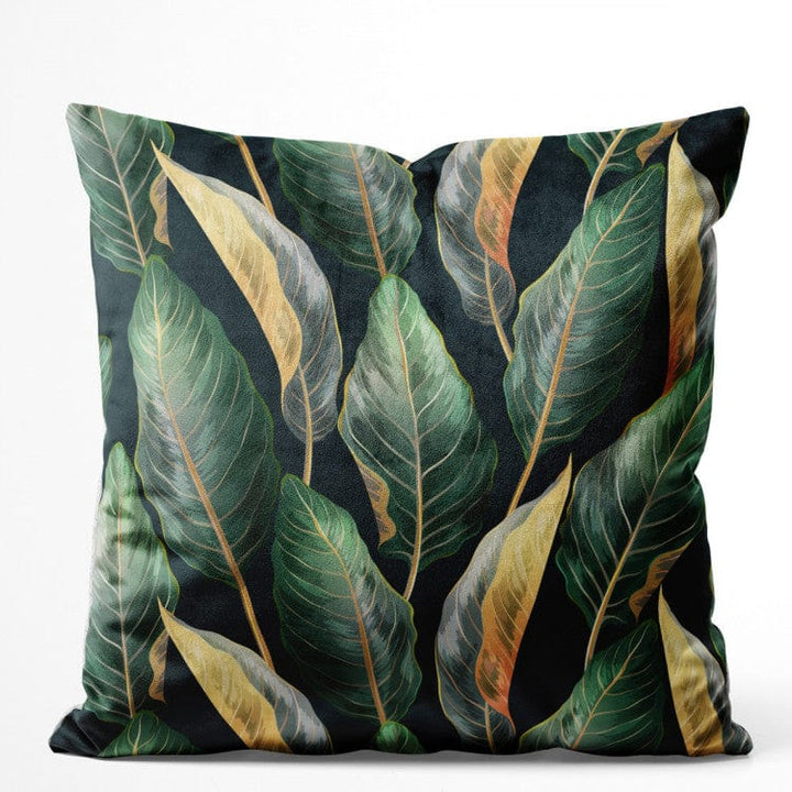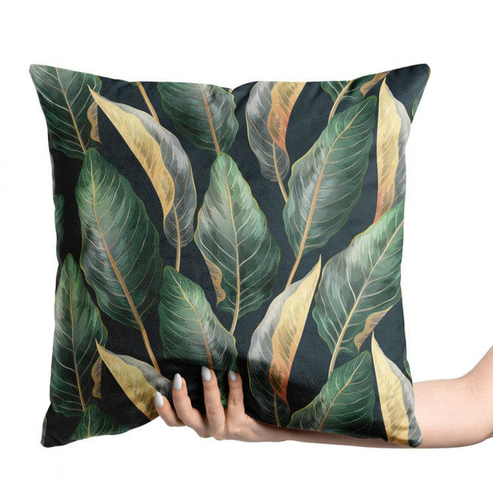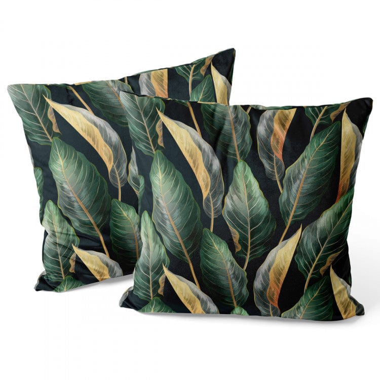 Veluurityynyliinat - Trooppinen kuvio vihreillä lehdillä ja kullalla tummalla pohjalla, 147089