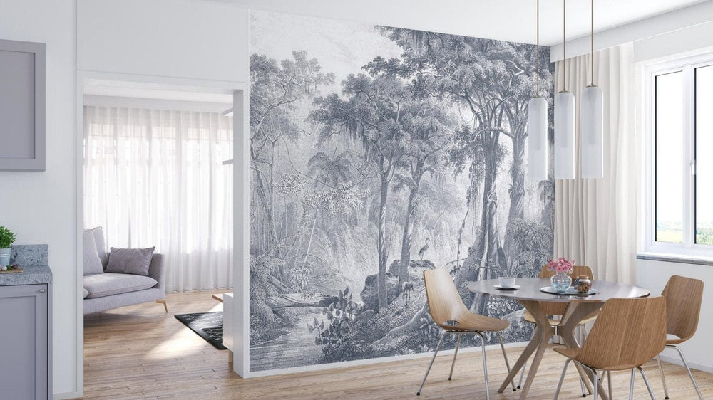 Valokuvatapetti viidakko ja palmupuut harmaana, RASCH, 2045776, 371x300 cm, 371x300 cm
