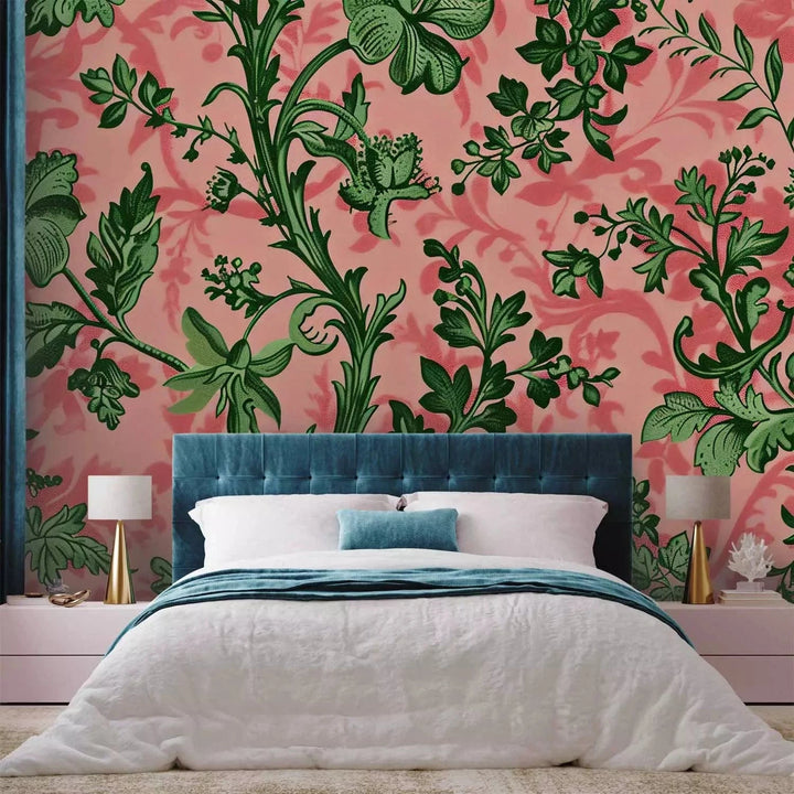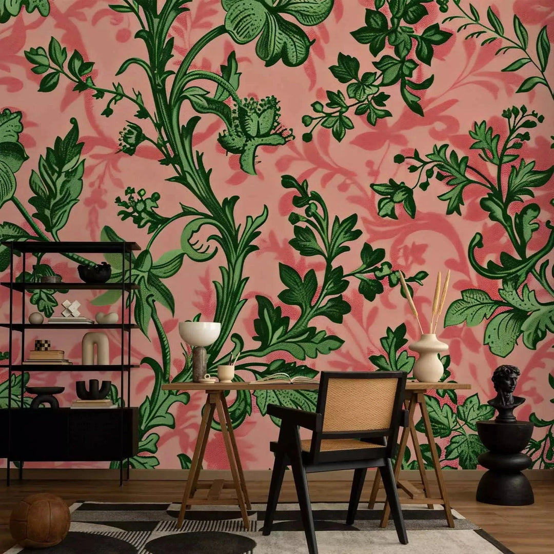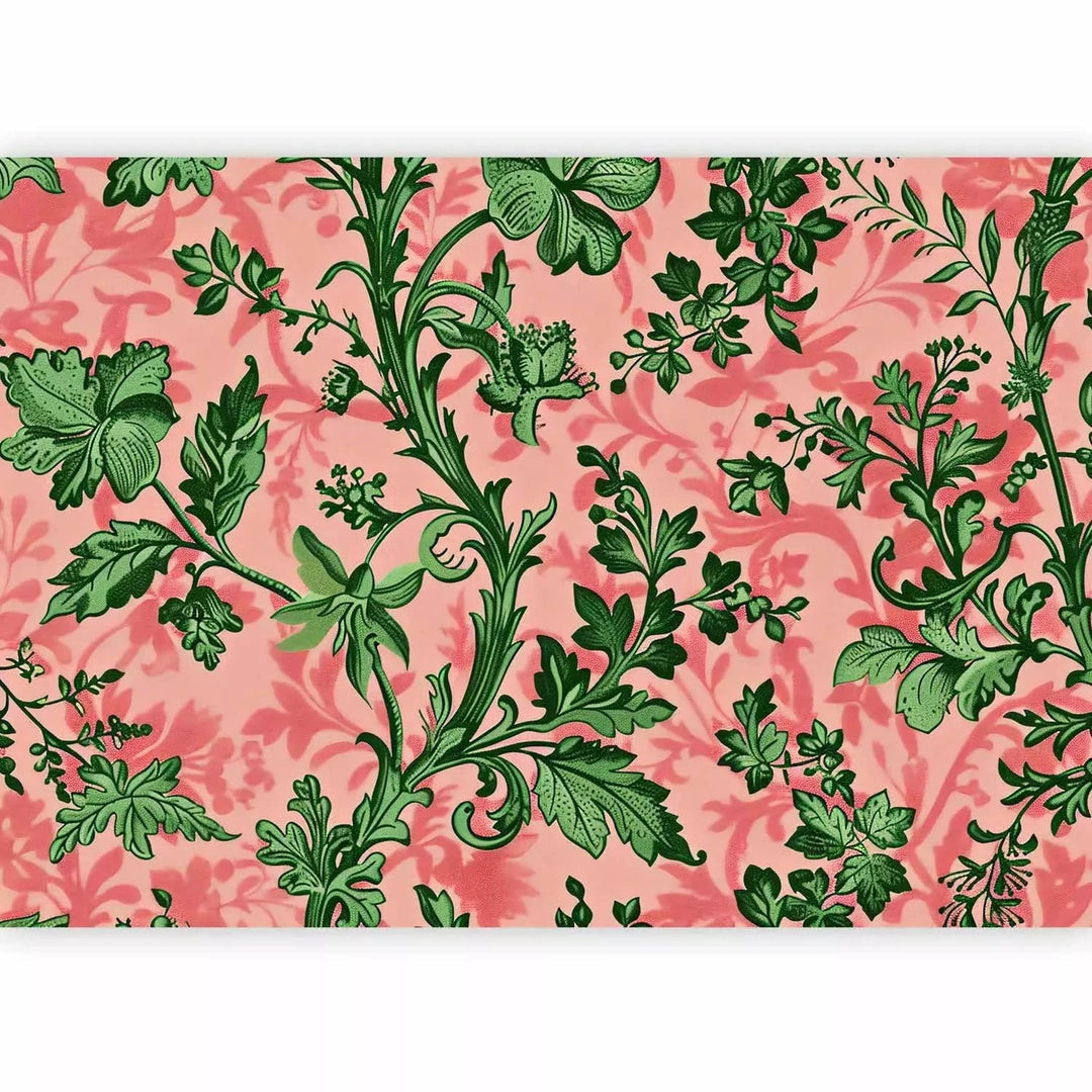 Valokuvatapetti - Vihreät lehdet - klassisia kukka-aiheita vaaleanpunaisella pohjalla, 160412