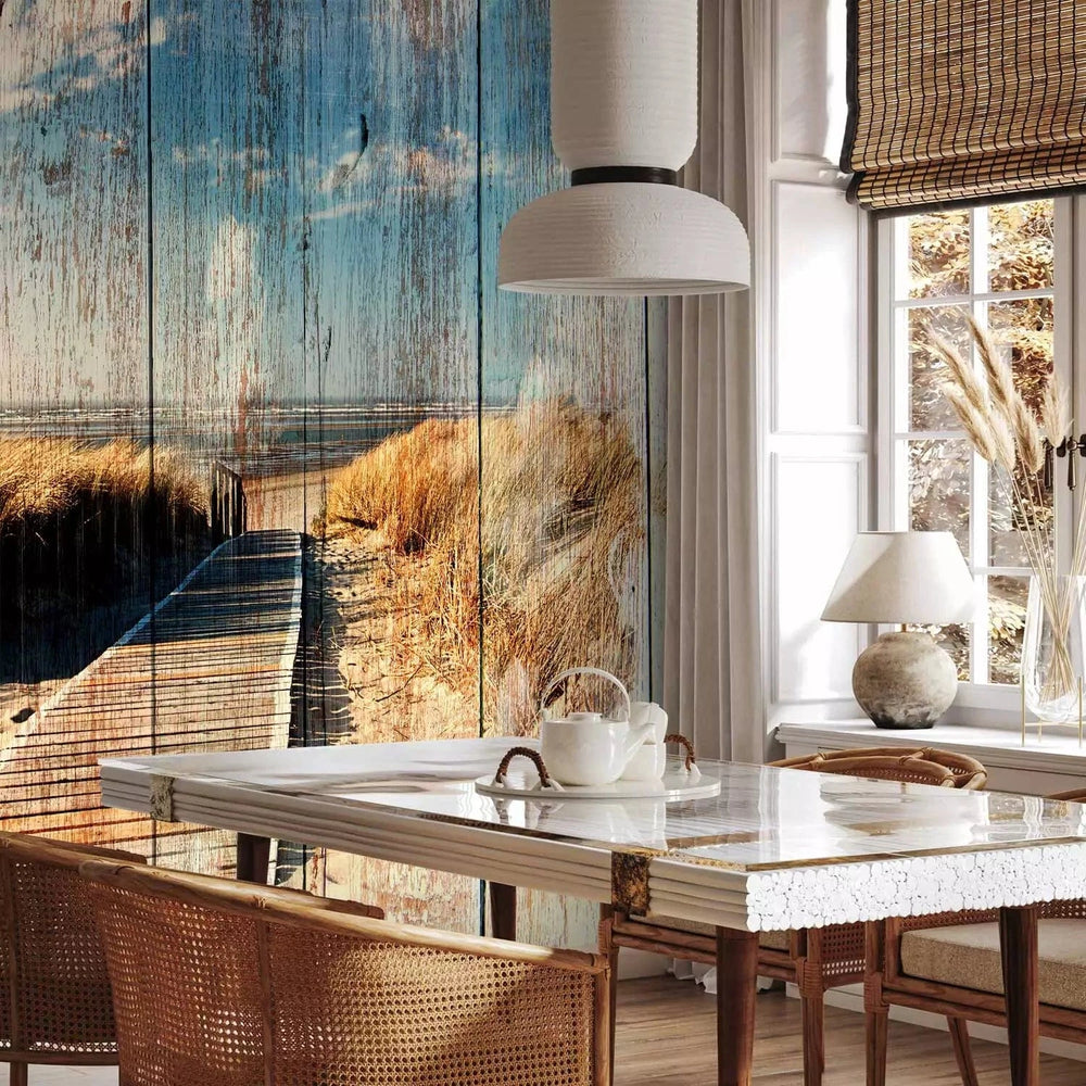 Valokuvatapetti - ranta- ja meriaiheita puitaustalla, 92027