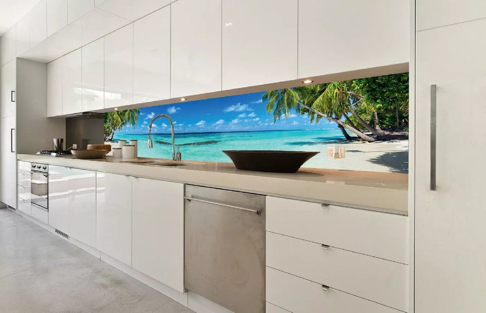 Valokuvatapetti keittiöön laminointi, itseliimautuva kalvo ja laatoitus - Paradise Beach (350x60 cm)