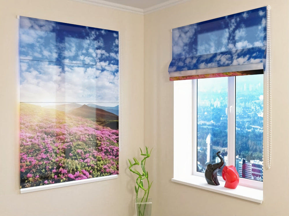 RomieĆĄu ĆŸalĆ«zijas, aizkari ar apdruku - Daba - Ziedi un kalni Tapetenshop.lv