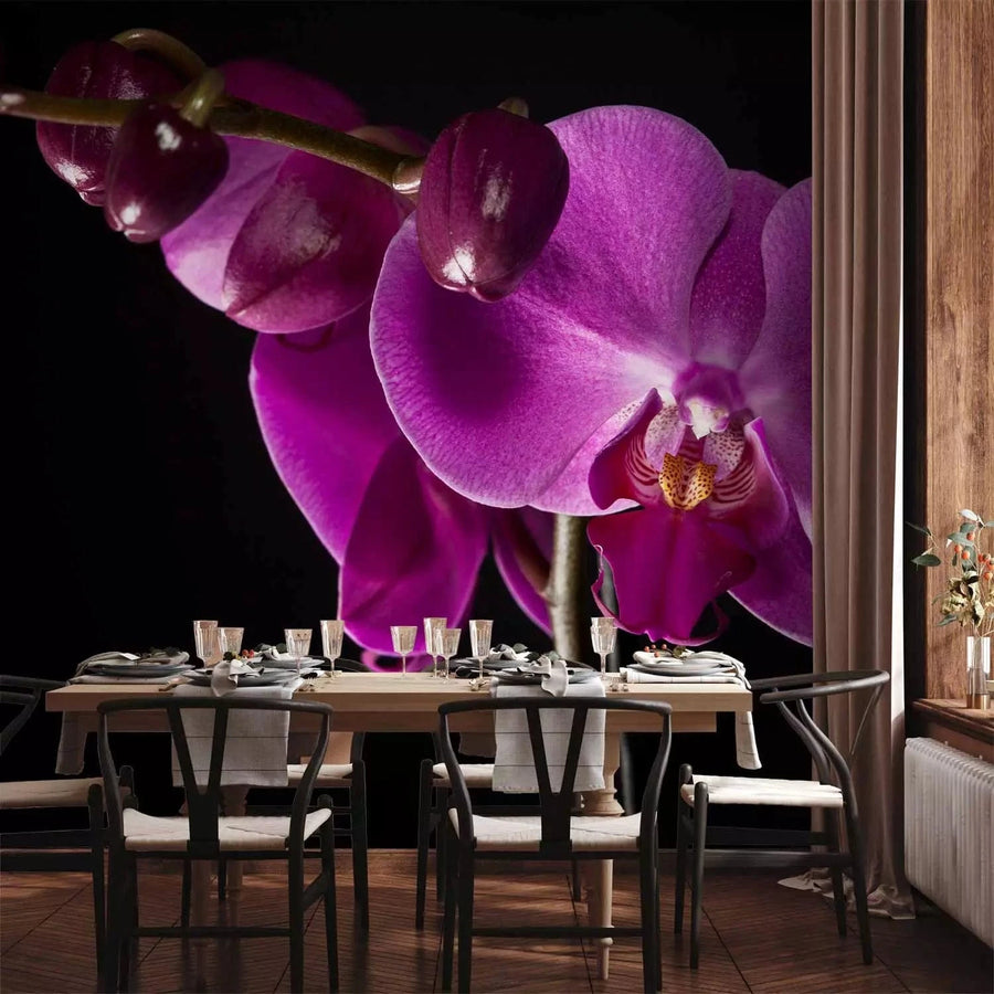 Fototapetes - Violetas orhidejas uz melna fona viesistabas interjerā G-ART