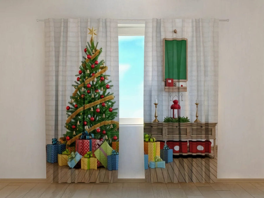 Joulukoristeiset verhot - Joulukuusi lahjoineen