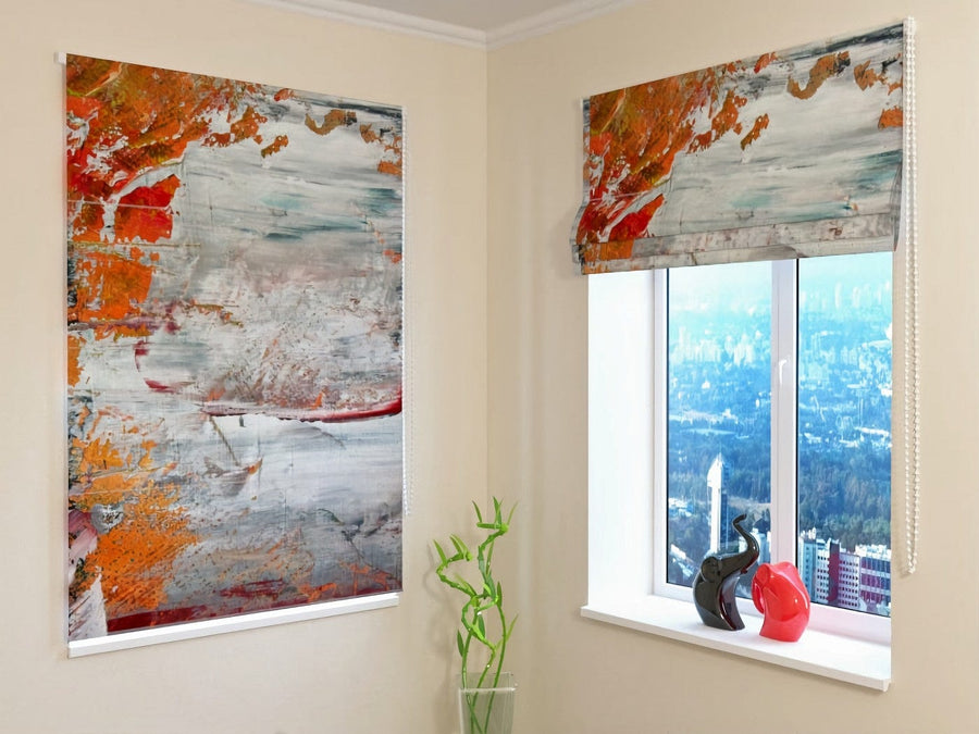 Romiešu žalūzijas ar abstrakta rakstu- Moderns pelēks un oranžs fons Tapetenshop.lv