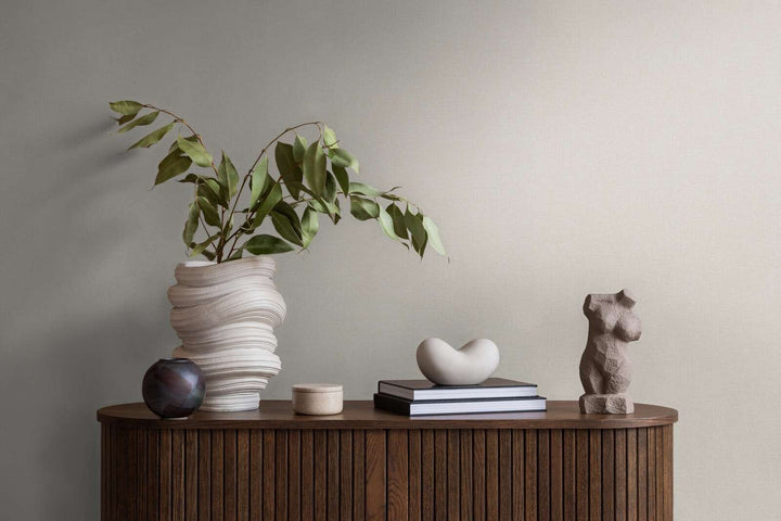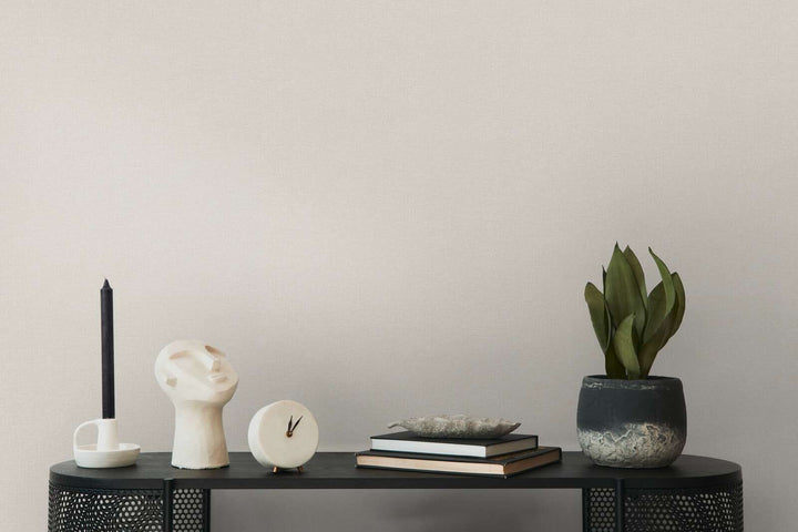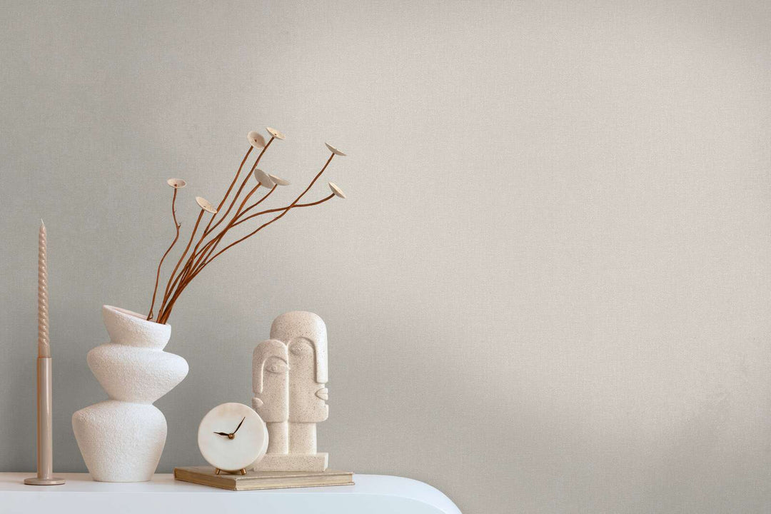 Bēšas tapetes ar teksturētu virsmu rada siltu, harmonisku vidi, kas iederas jebkurā mājoklī.