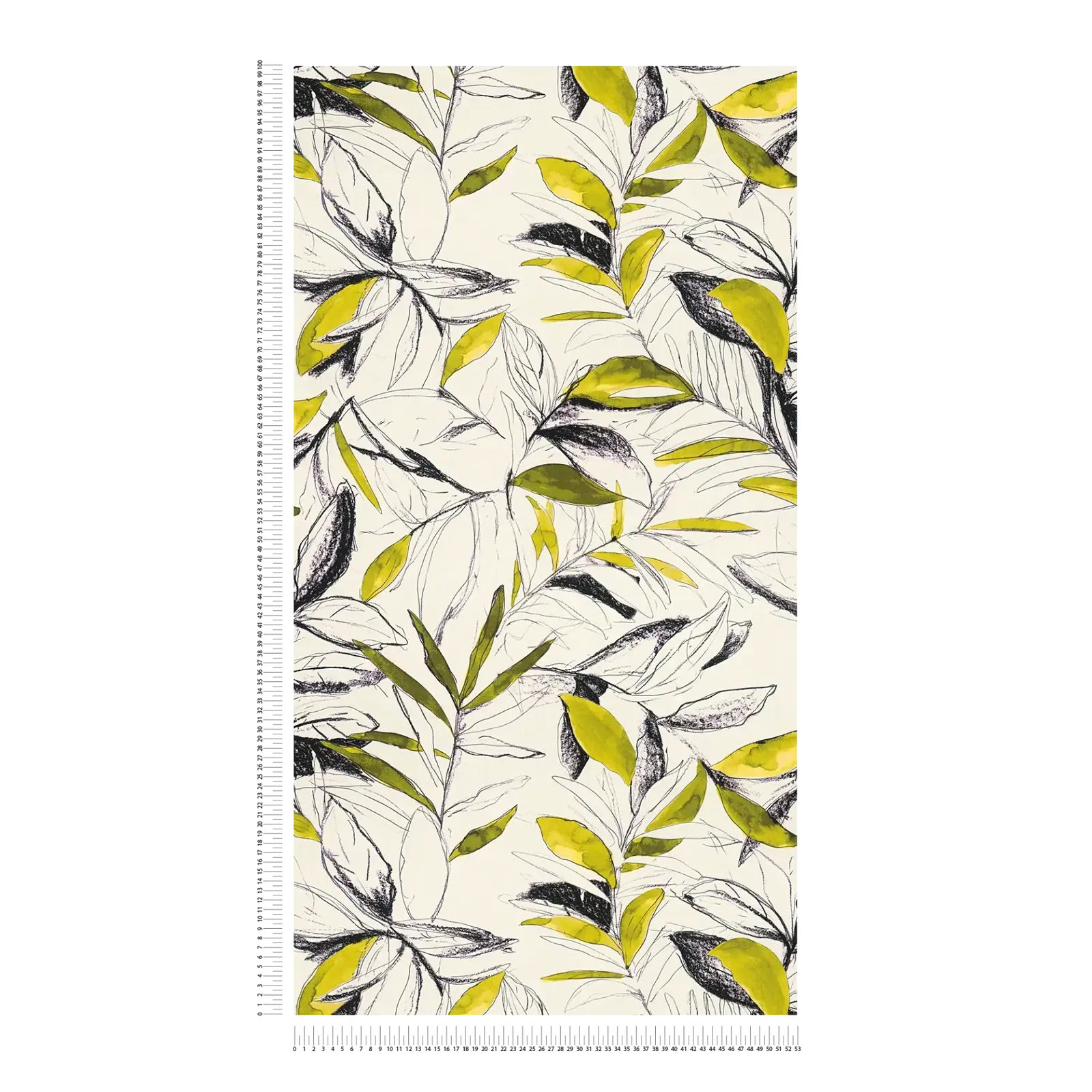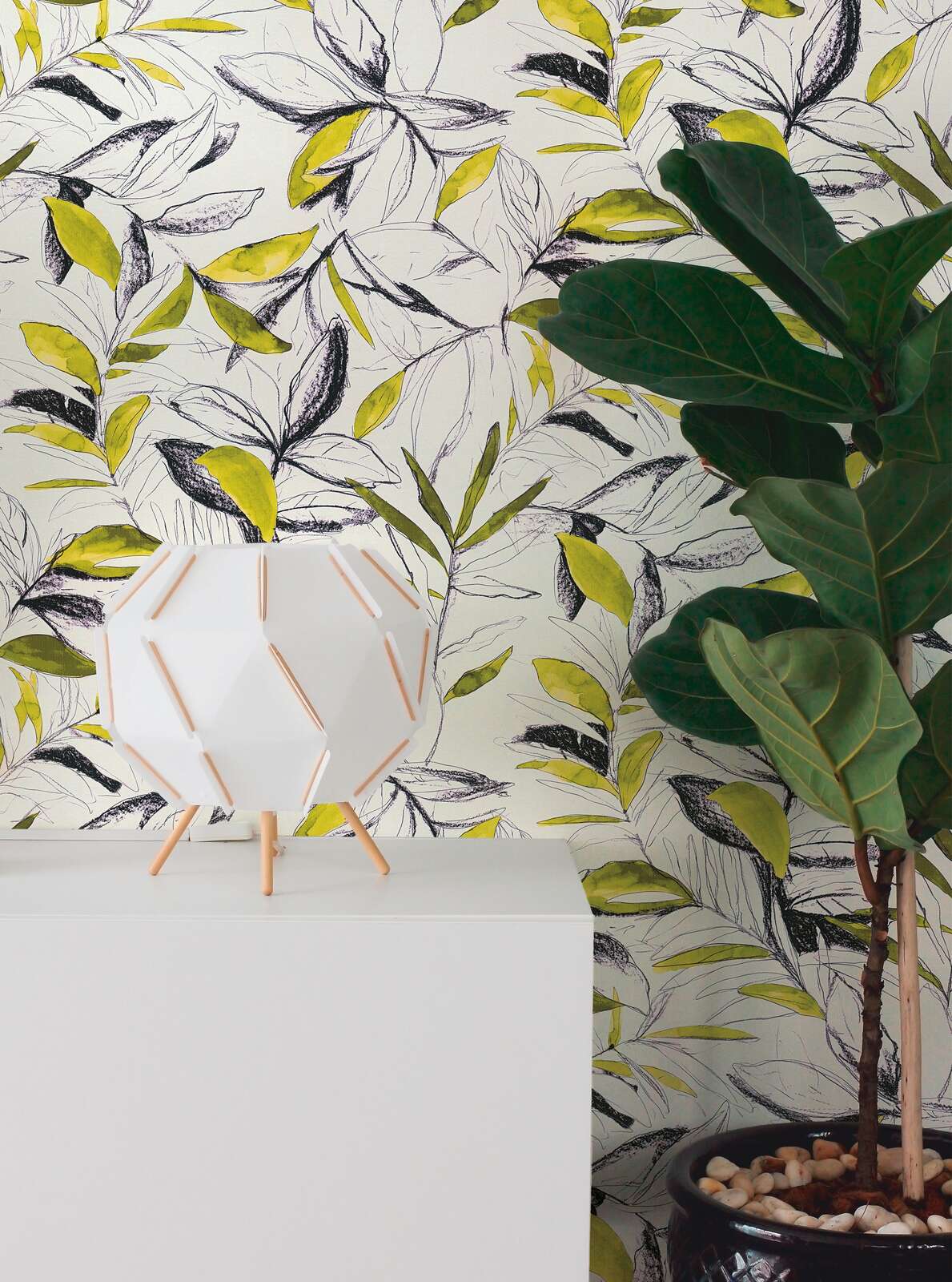 Motivi kuvaa suuria, abstrakteja lehtiä dynaamisessa vuorovaikutuksessa kelta-vihreiden sävyjen ja mustien viivojen kanssa. Lehdet muistuttavat trooppisia kasveja ja ovat osittain täytettyjä rikkailla väreillä, osittain vain hahmotettuja hienoilla ääriviivoilla. Tausta on lämminvalkoinen ja siinä on hienovarainen tekstuuriefekti, joka luo miellyttävän kontrastin ilmeikkäälle lehtikuvioinnille. Oliivinvihreän, keltaisen ja mustan yhdistelmä luo modernin, hieman taiteellisen ilmeen, kun taas lehtien vapaa, epäsäännöllinen järjestys antaa kuviolle tiettyä eloisuutta ja raikkautta. Kokonaisvaikutelma on luonnollinen, piristävä ja tyylikäs, mikä sopii erinomaisesti tuomaan ripauksen eksoottisuutta ja studioilmapiiriä mihin tahansa huoneeseen.