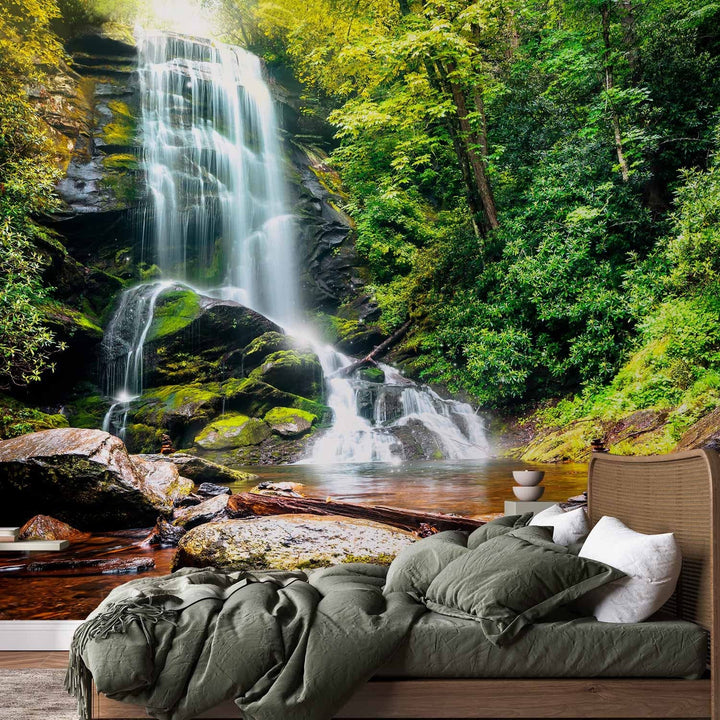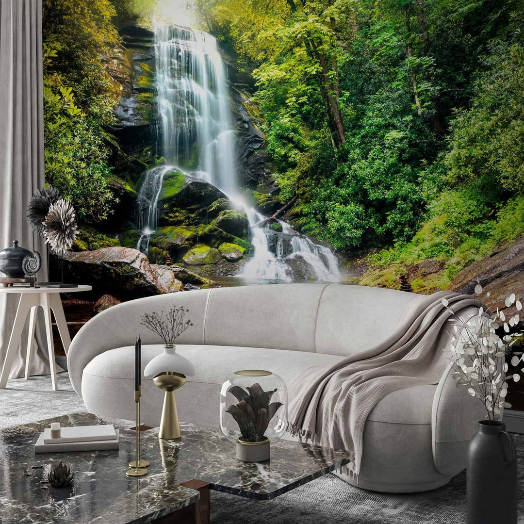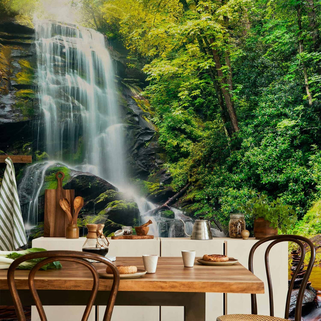 Valokuvatapetti - Luonnonihme - maisema, jossa vesiputous virtaa kivien yli keskellä metsää, 60061