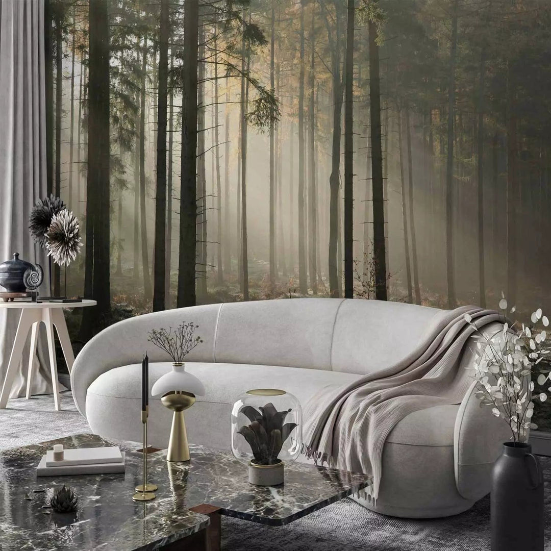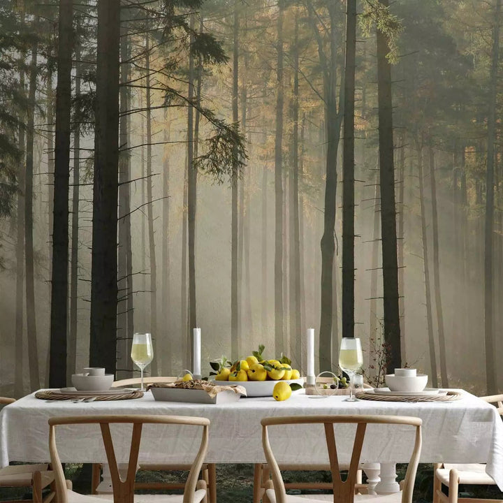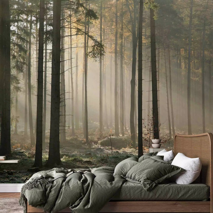 Valokuvatapetti - Metsämaisema, jossa on korkeita puita syyssumussa, 60522