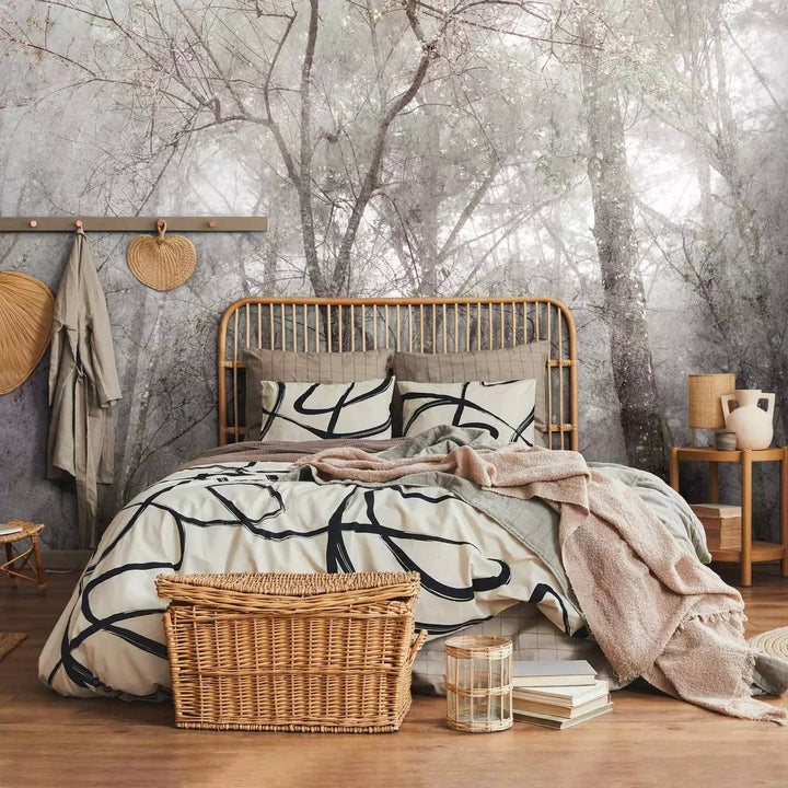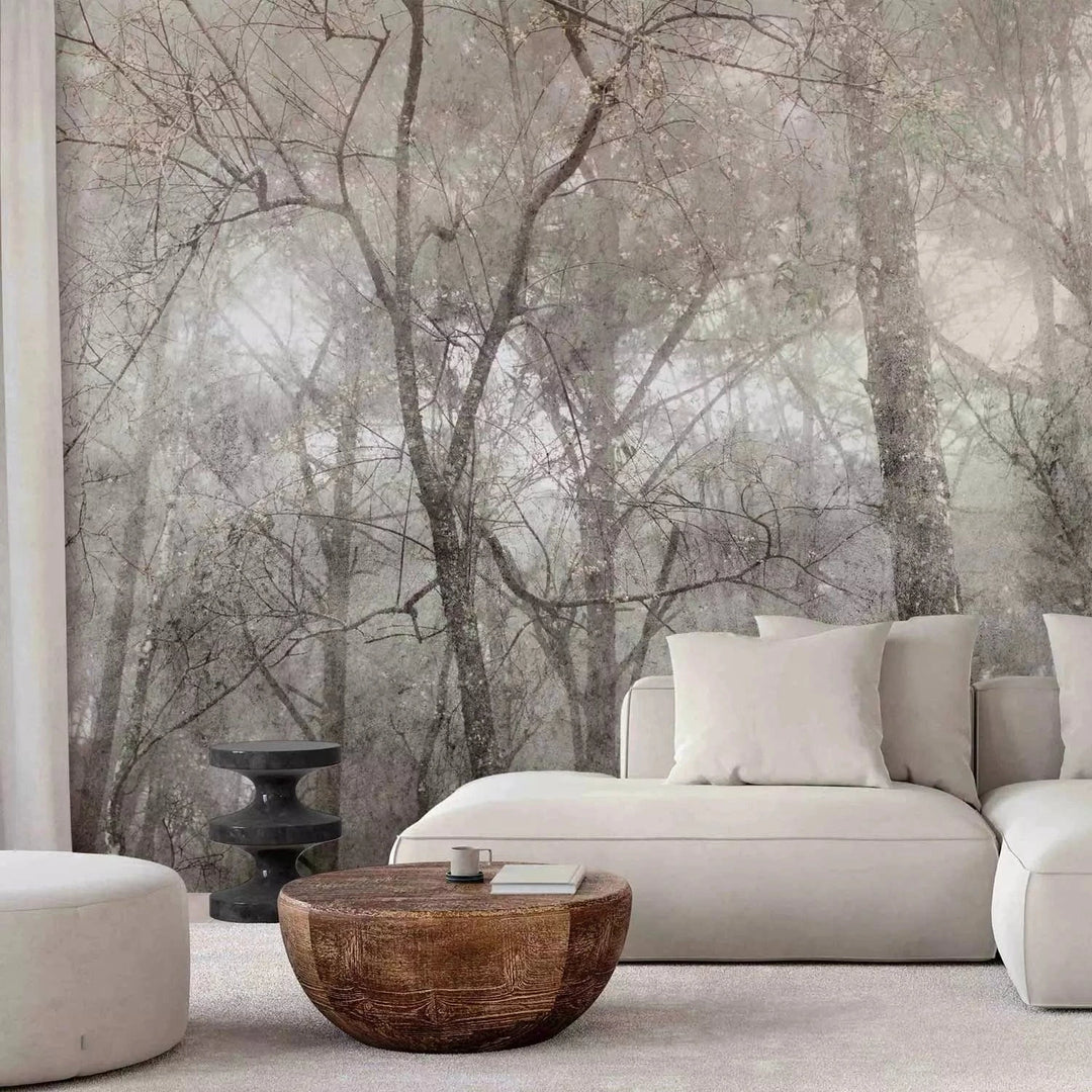 Valokuvatapetti - Puiden kruunut - harmaa metsämaisema puiden kanssa vintage-tyyliin - 137880