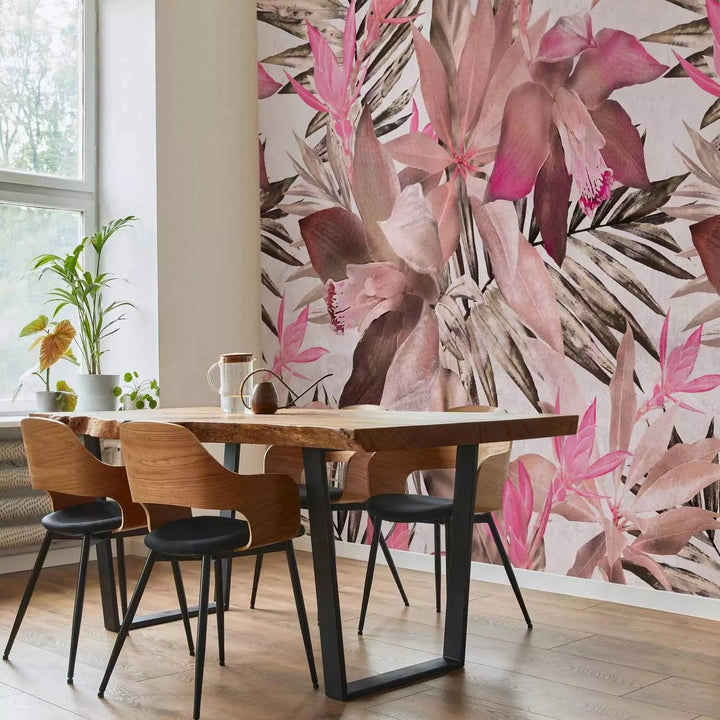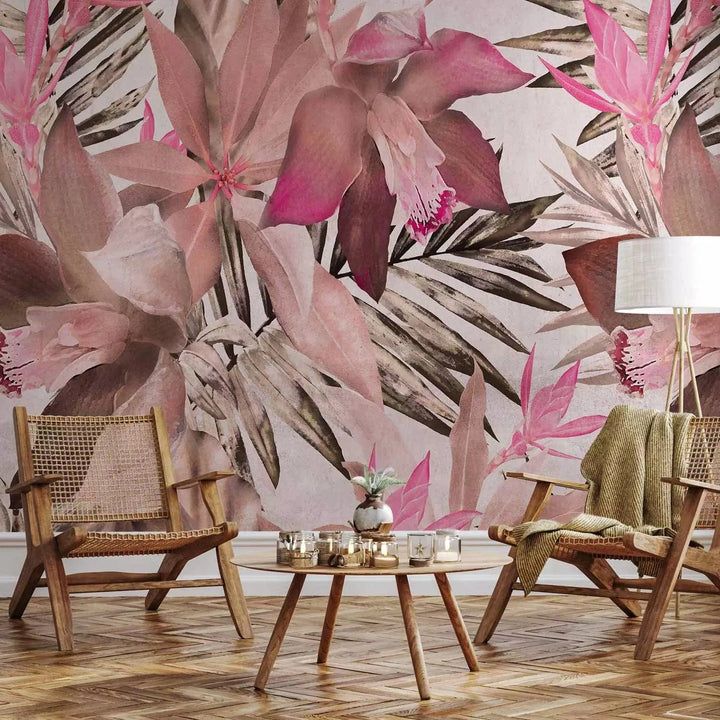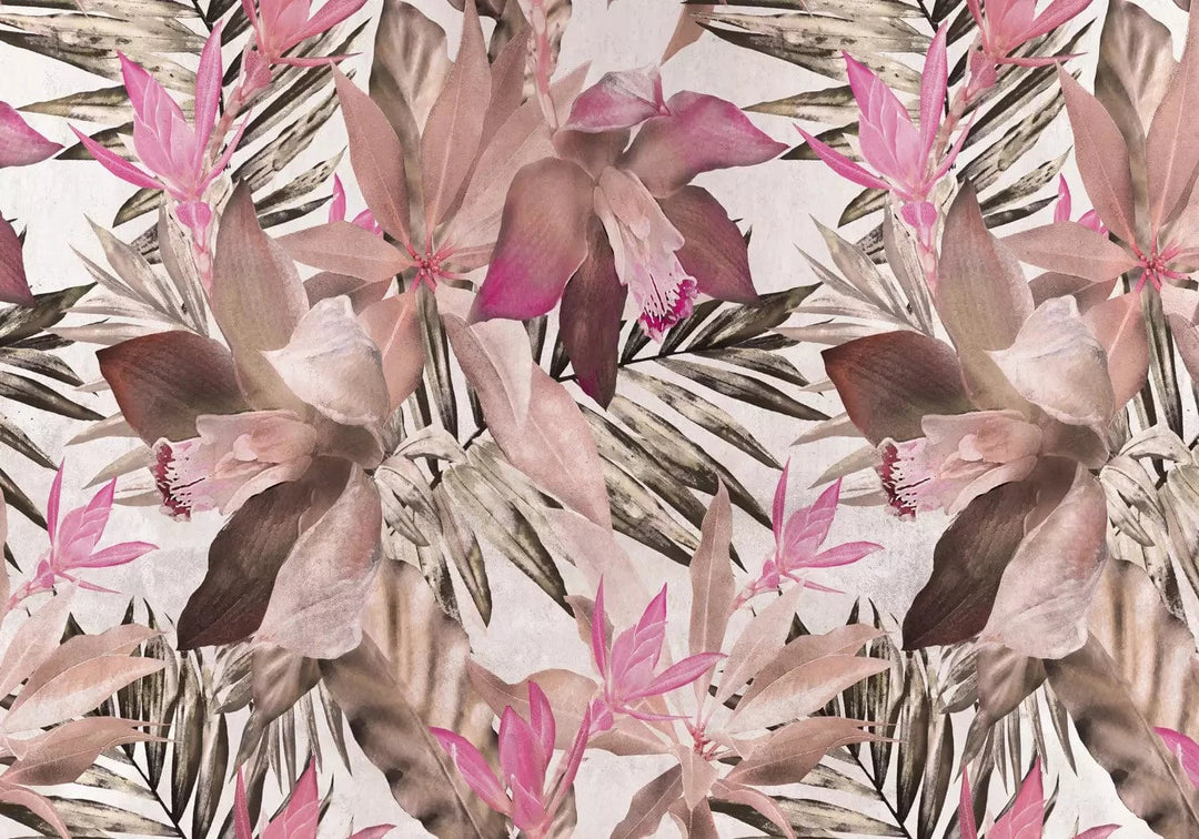 Valokuvatapetti - Vaaleanpunainen sommitelma lehtien kanssa - Blooming Jungle - 135732