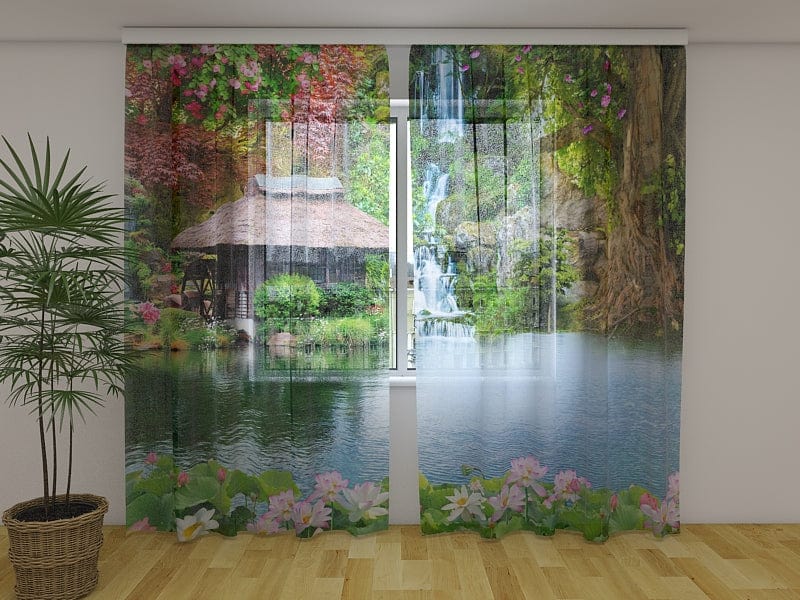 Verhot kukkakuvioilla – Luonto – Itämainen puutarha vesiputouksella