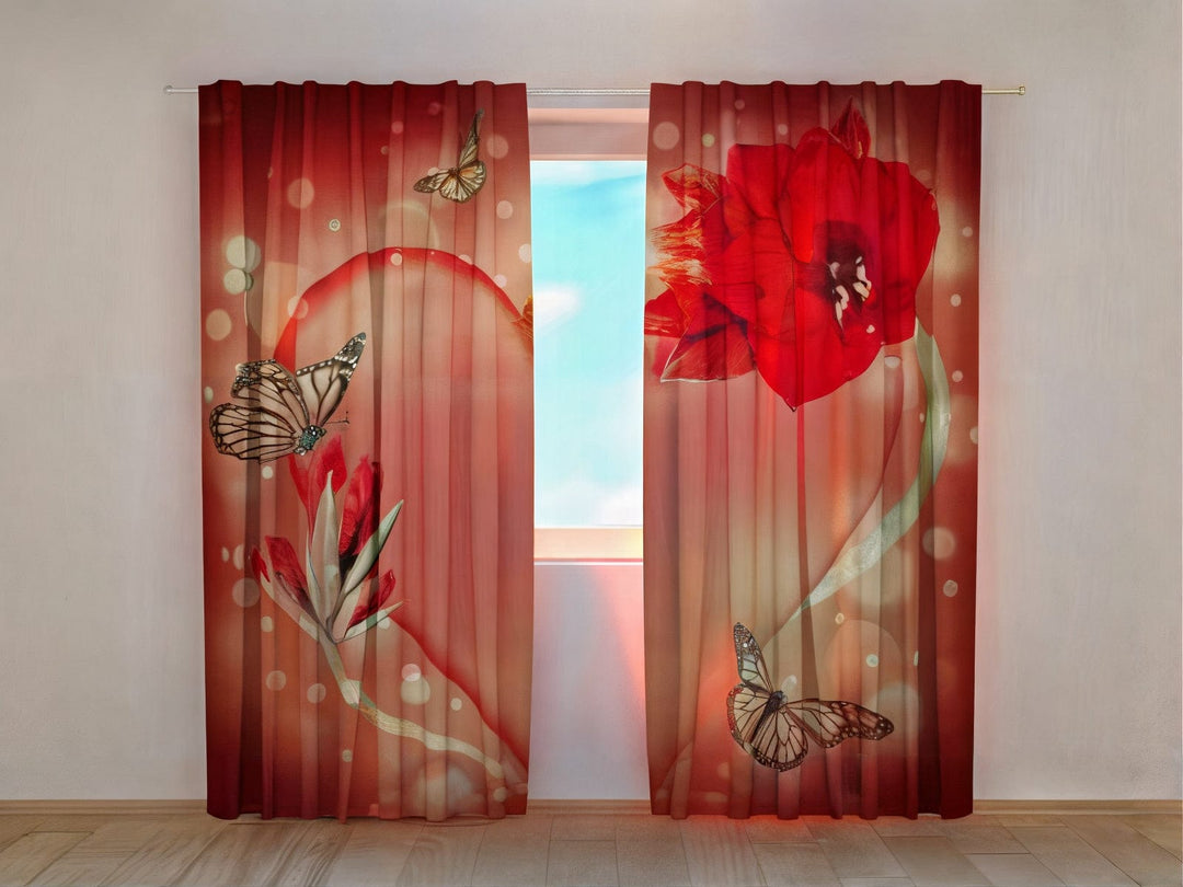 Romanttiset verhot perhosilla ja rakkauskuvioilla punaisissa sävyissä