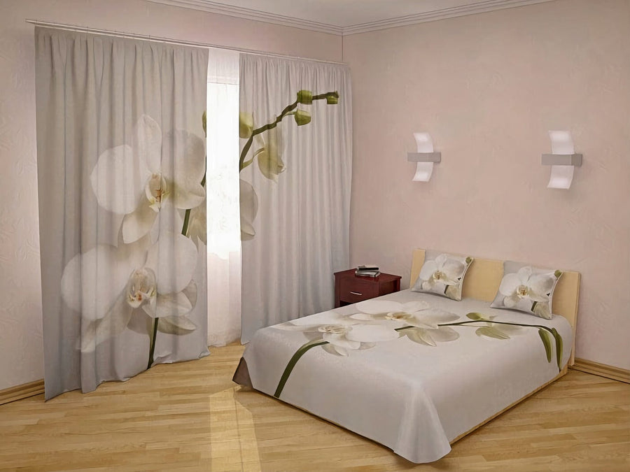 Gultas pārklājs ar baltām orhidejām uz pelēka fona - uz pasūtījumu Digital Textile