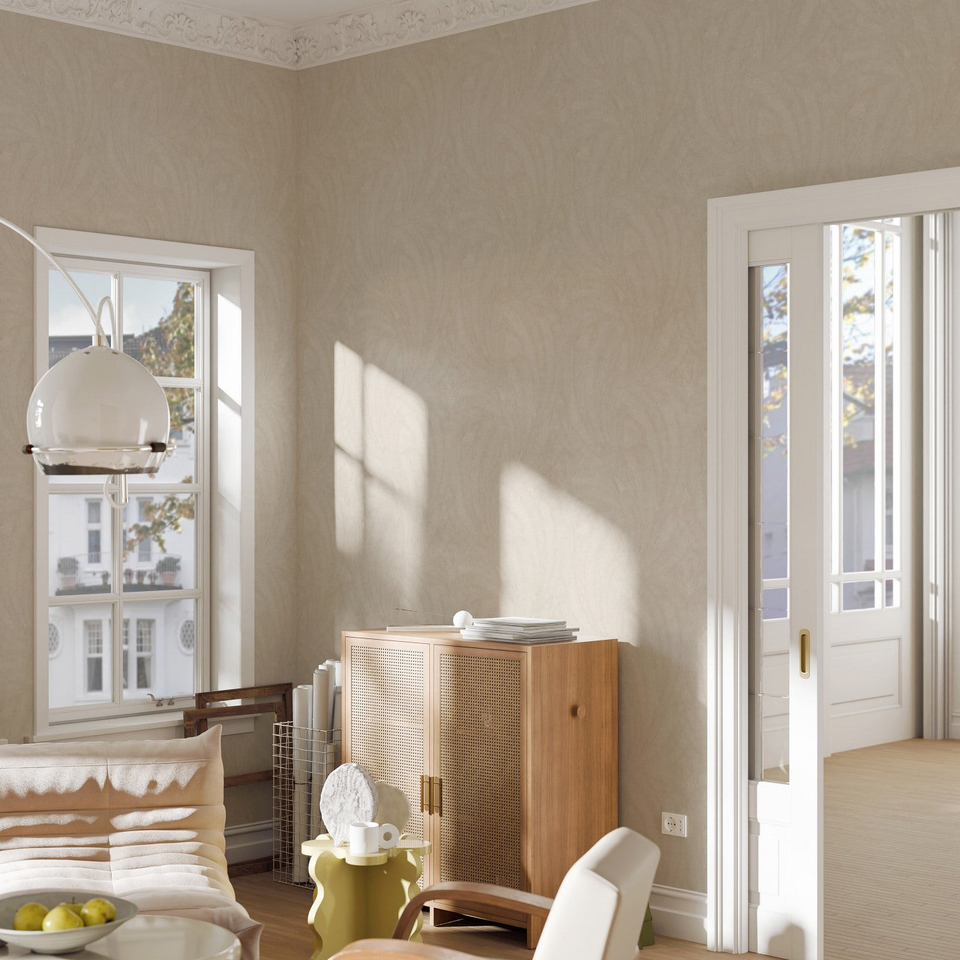 Gamtos motyvai. Smėlio spalvos lapai ant šiek tiek blizgaus paviršiaus sukuria nepastebimą, bet dekoratyvų foną natūraliam interjerui.