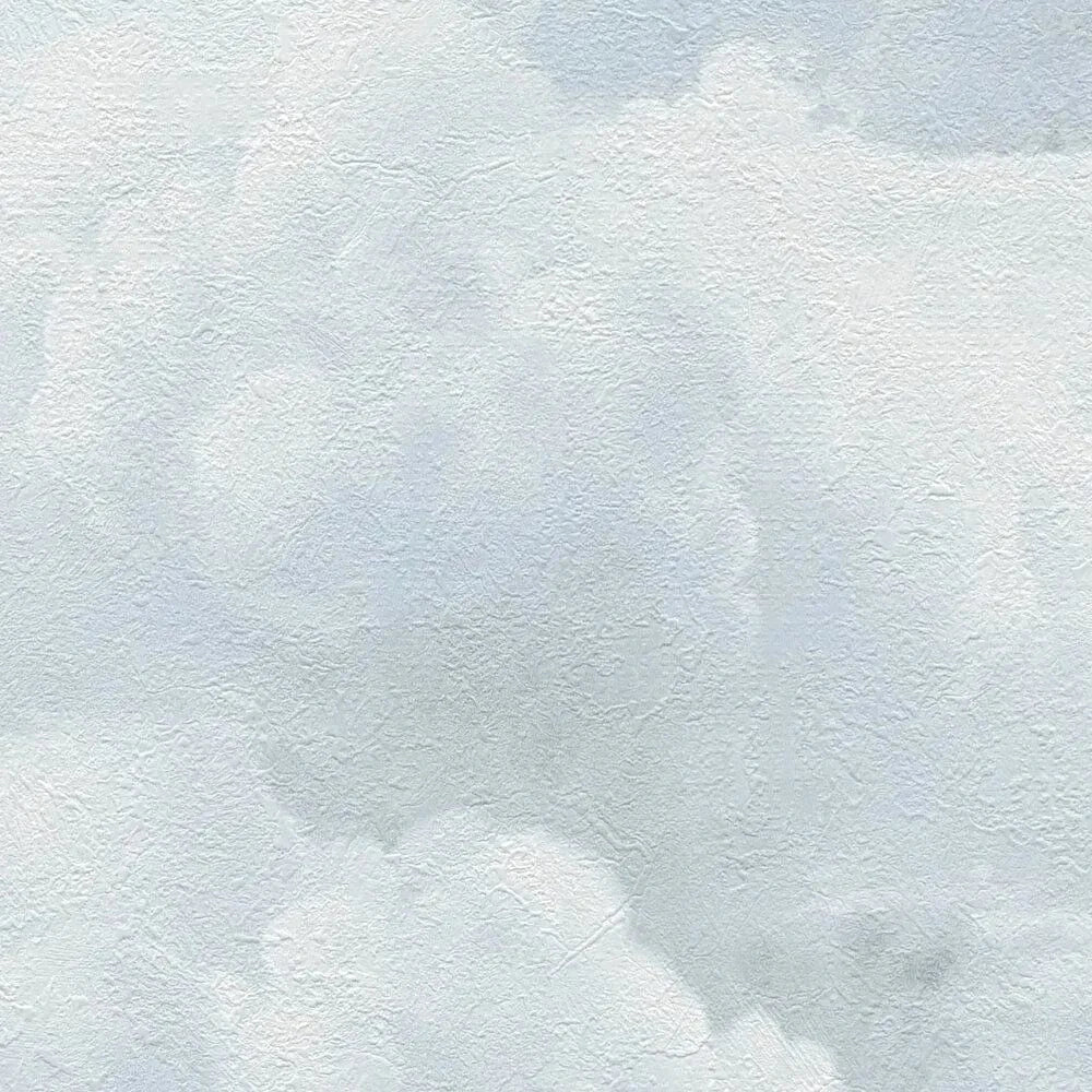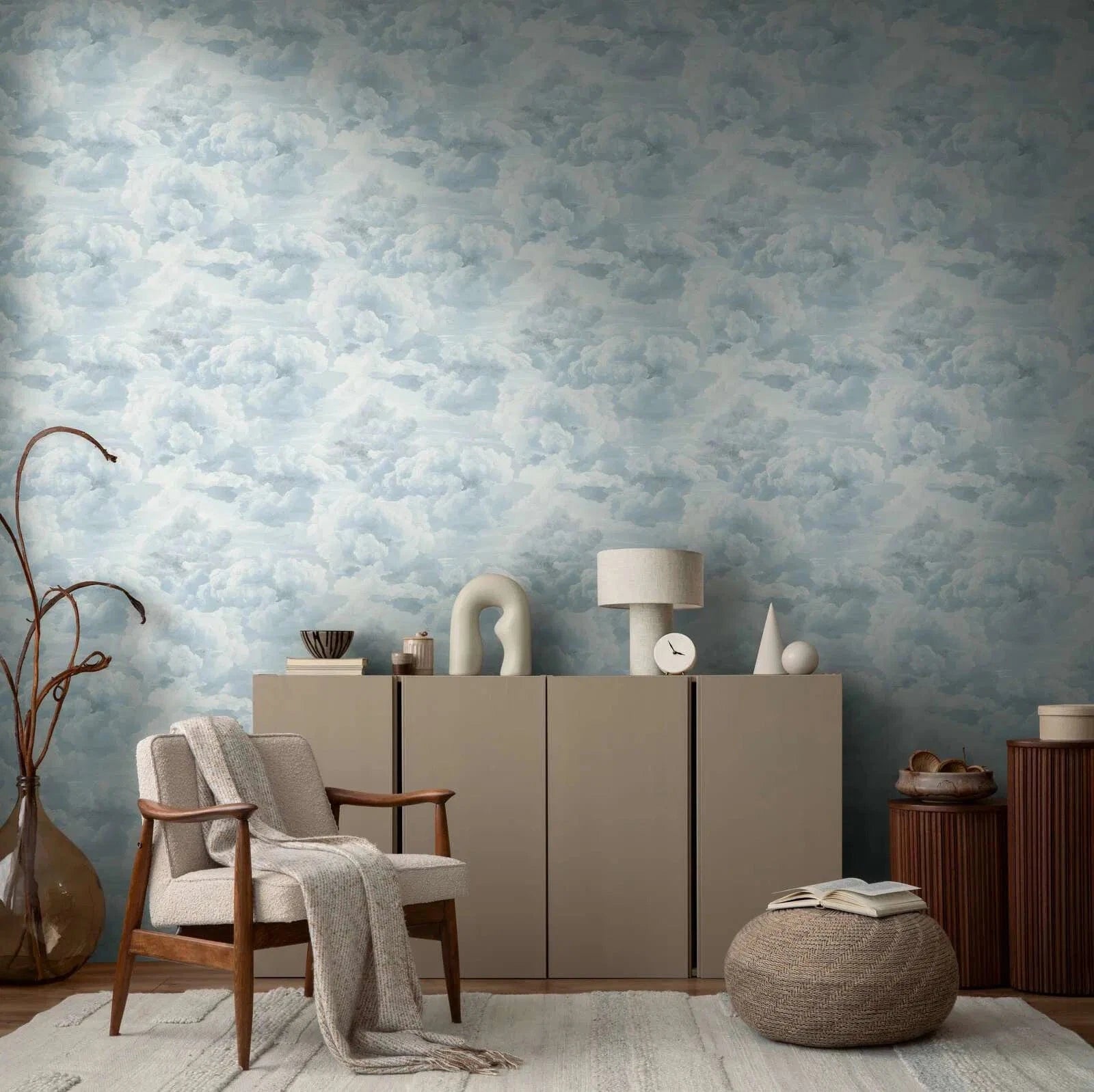 Mėlyno atspalvio tapetai su abstrakčiu debesų raštu suteikia interjerui gaivaus ir ramaus akcento.