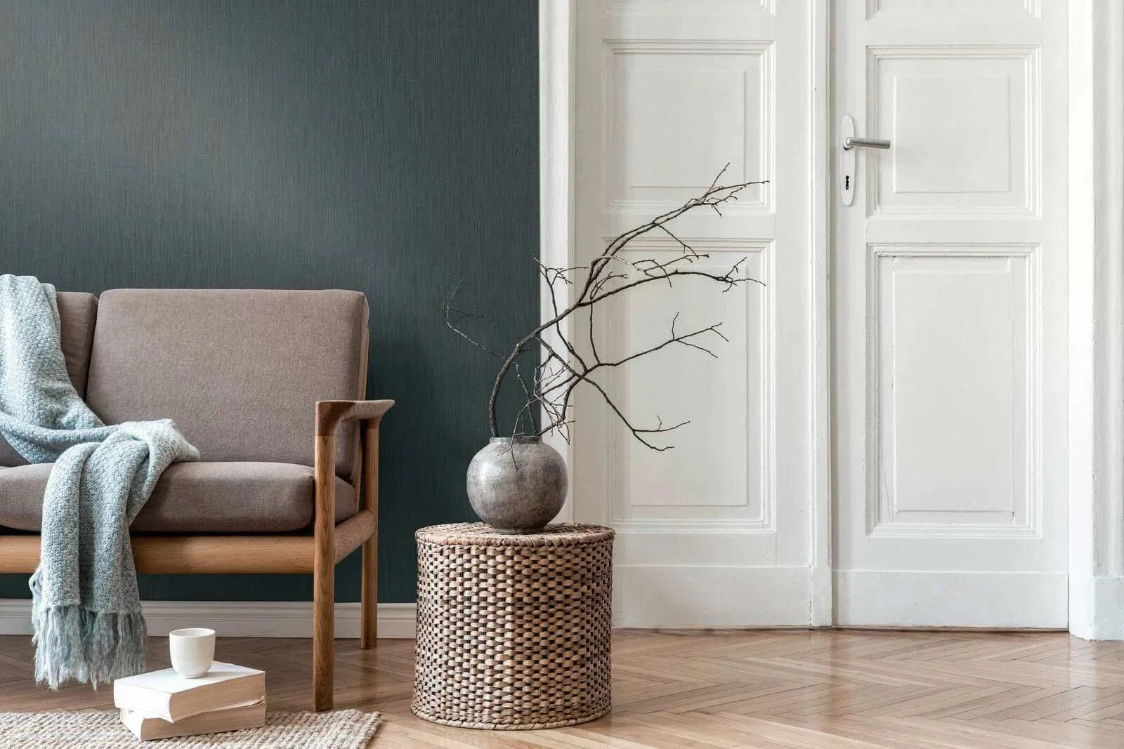 Danielio Hechterio tamsiai žali tekstilinės tekstūros tapetai sukuria rafinuotą ir ramią atmosferą.