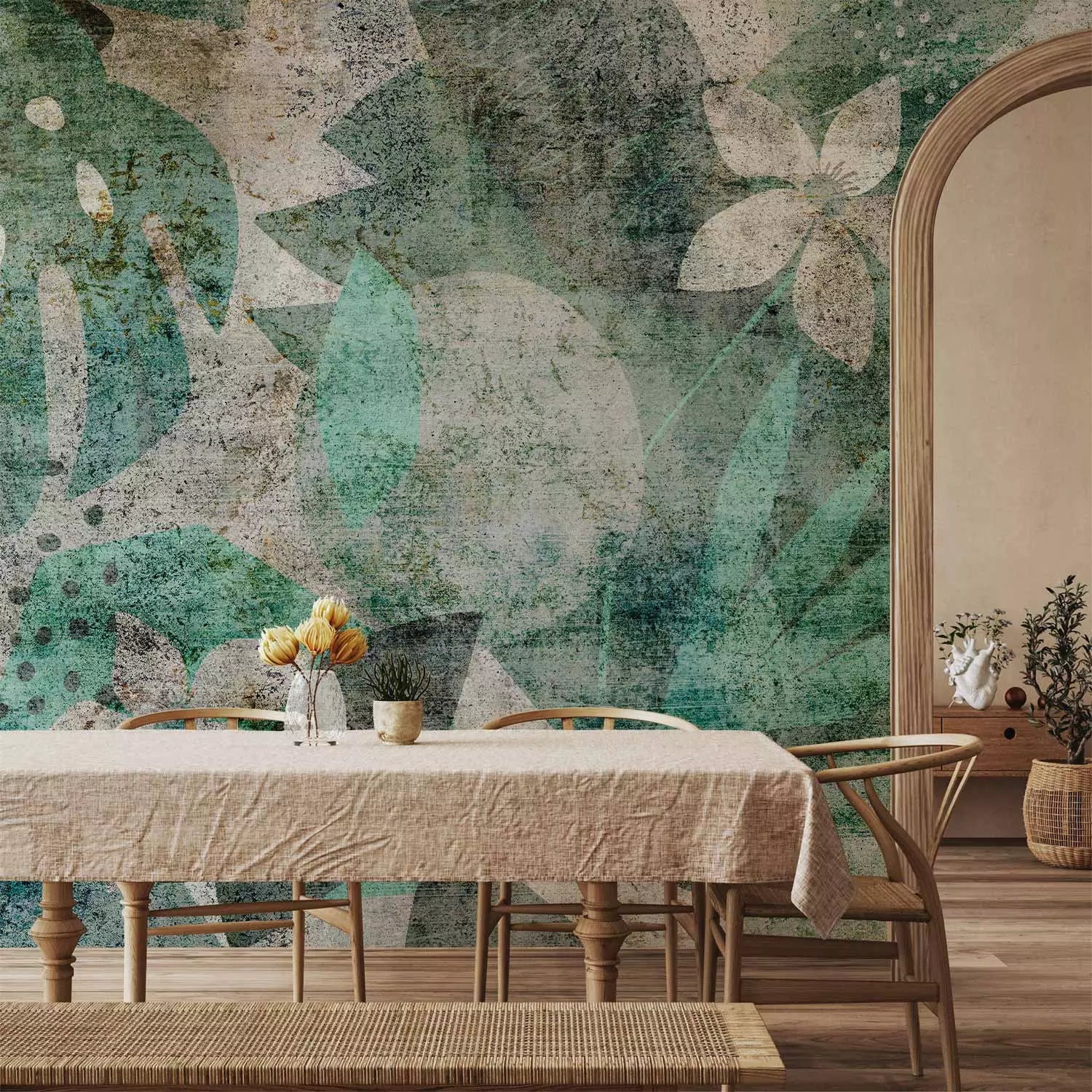 Fototapetai - žali lapai ir gėlės žalios spalvos vintažiniu stiliumi - 136092